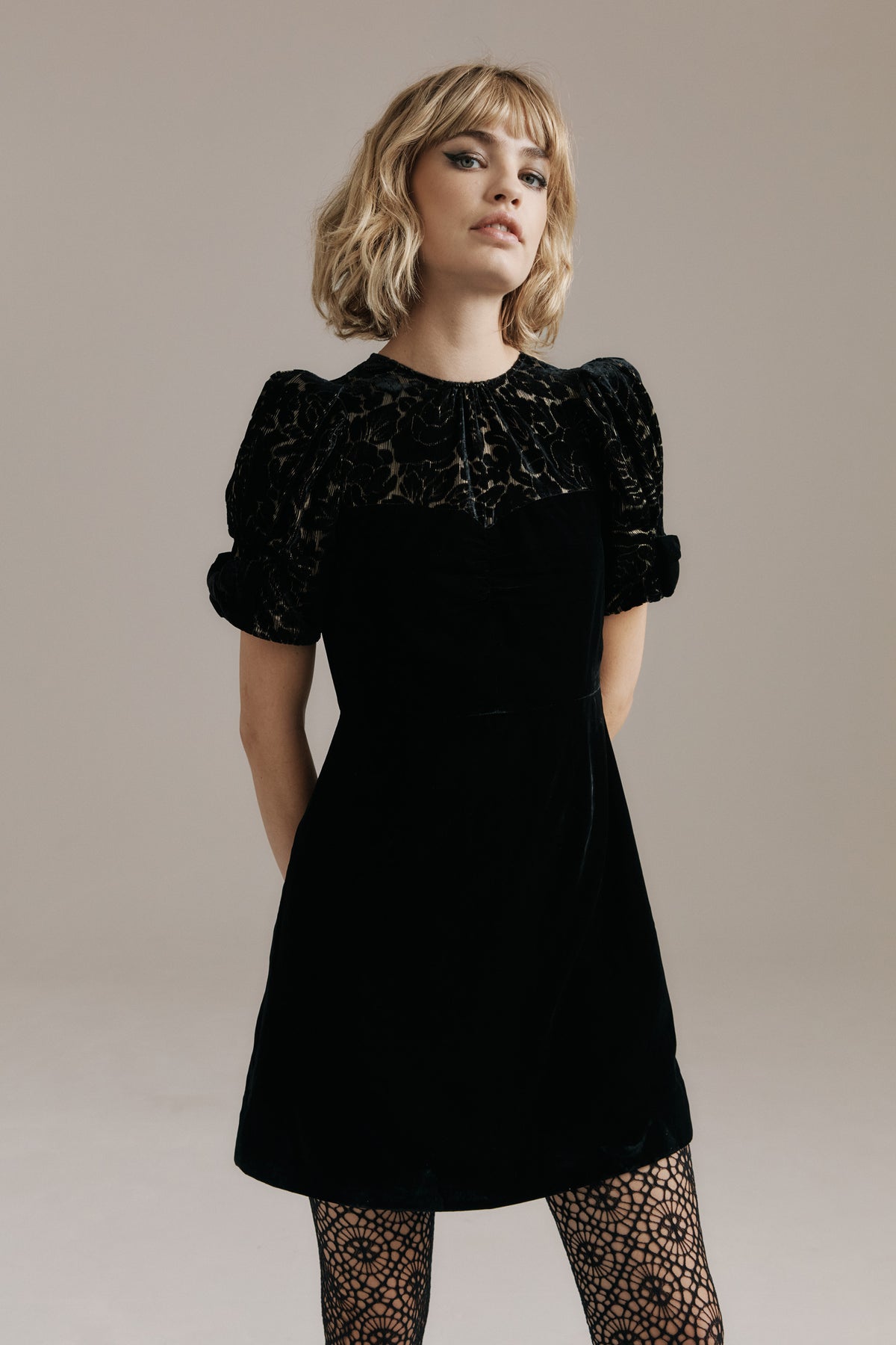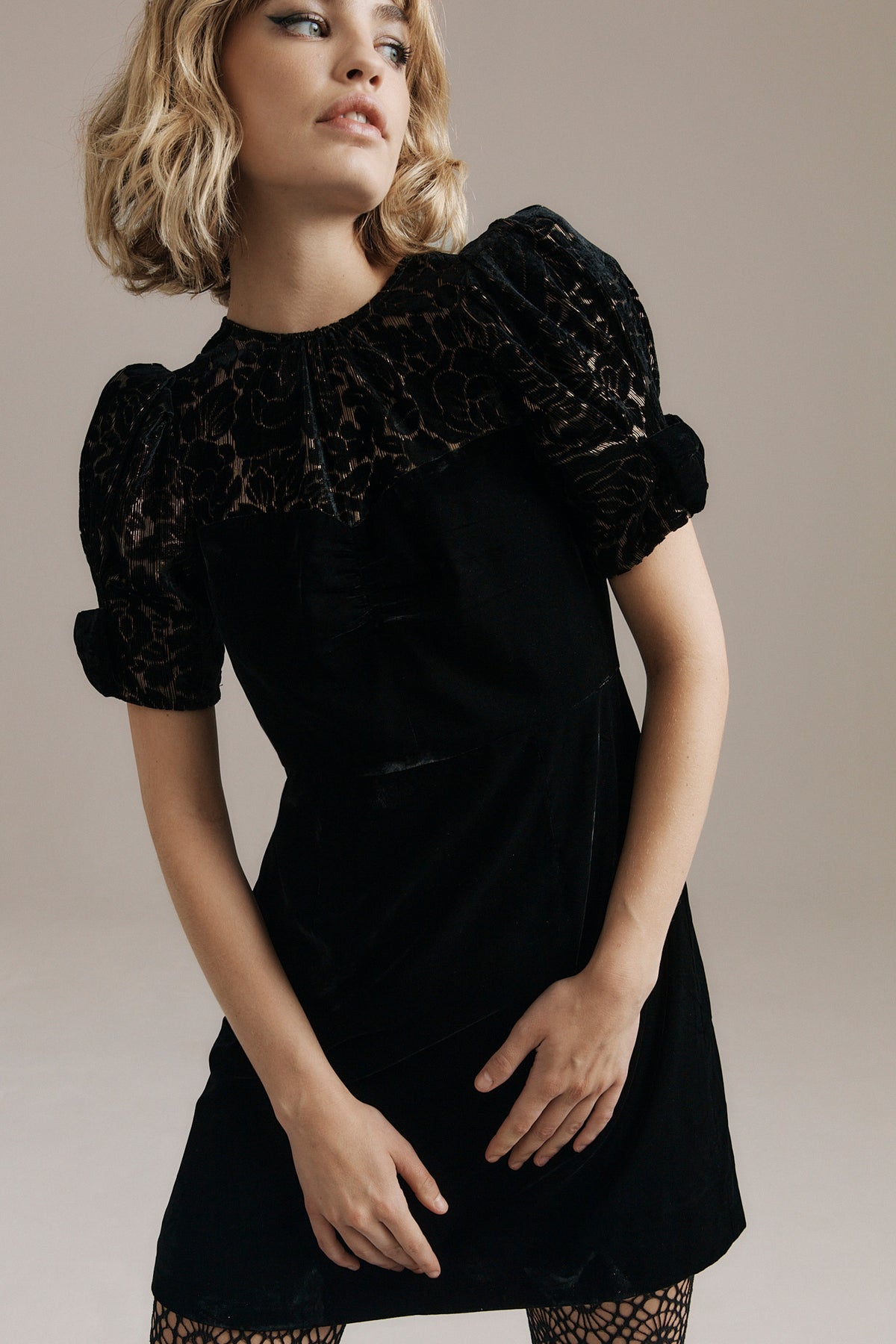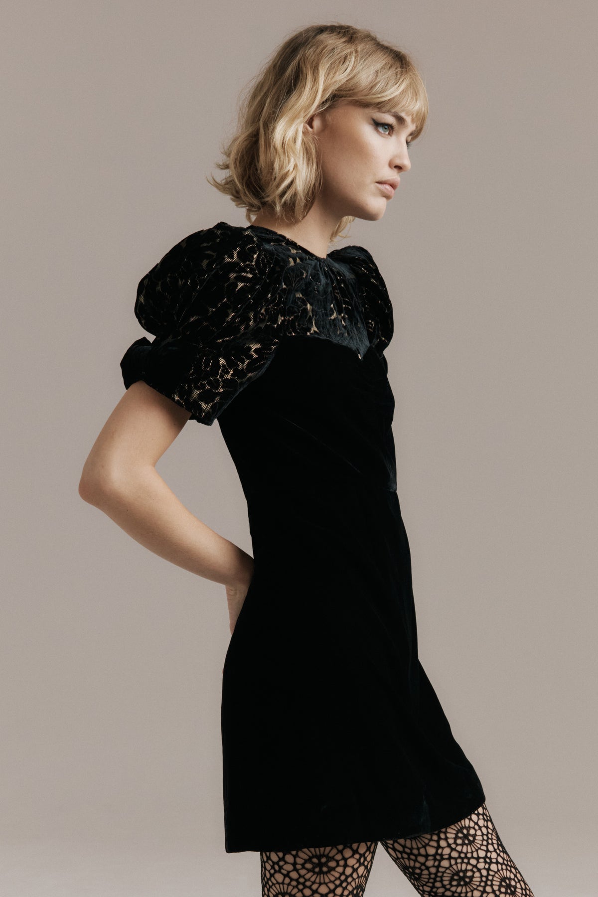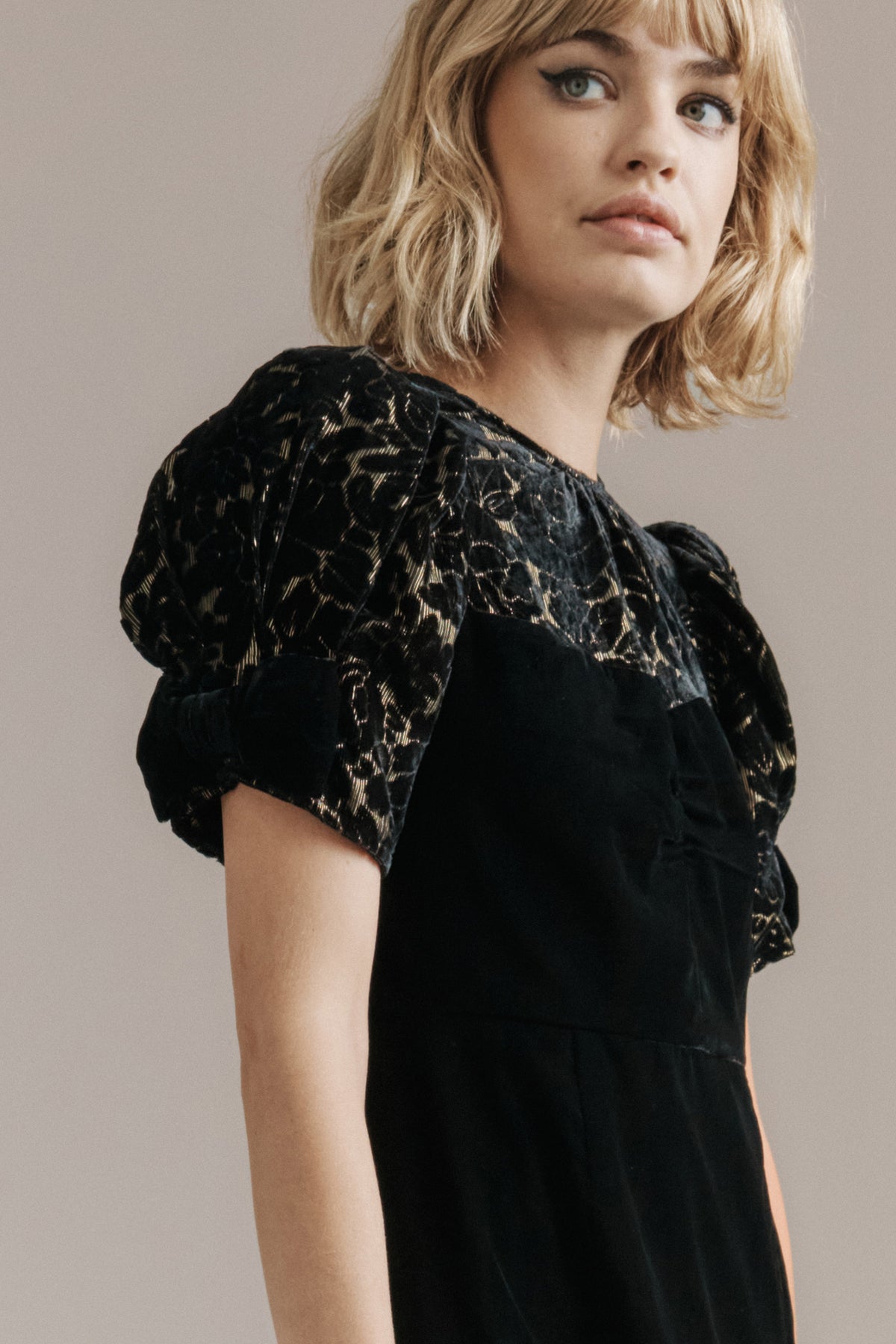 Drew is a velvet mini with a playful romantic energy and a sense of winter poise. Her bodice and sleeves are crafted in floral devoré velvet, the pattern threaded with fine gold lurex that catches the light in delicate sparks. Her softly ruched sweetheart neckline creates a flirtatious feminine curve, while her signature short puff sleeves finished with velvet bows bring a touch of vintage charm.