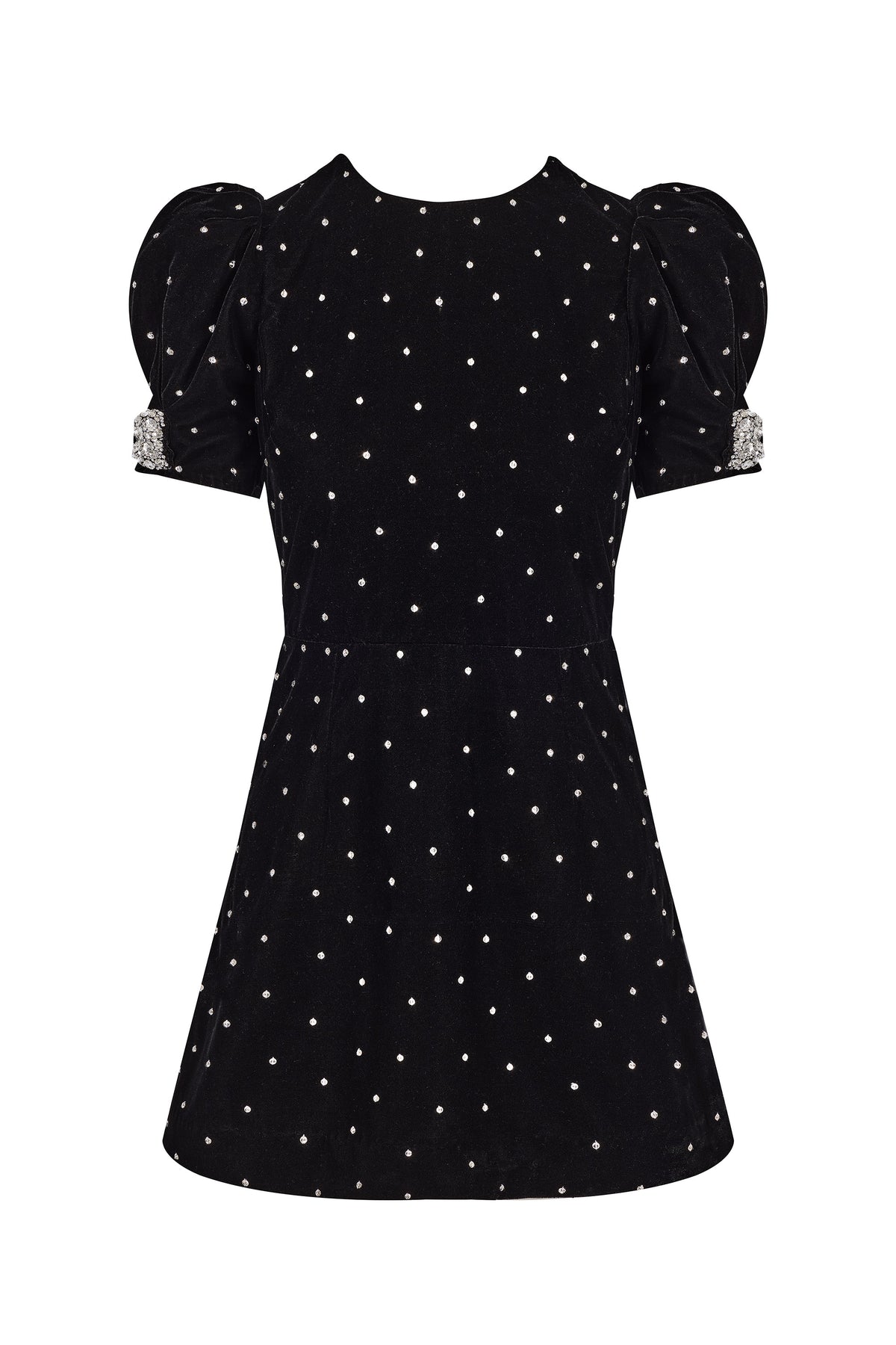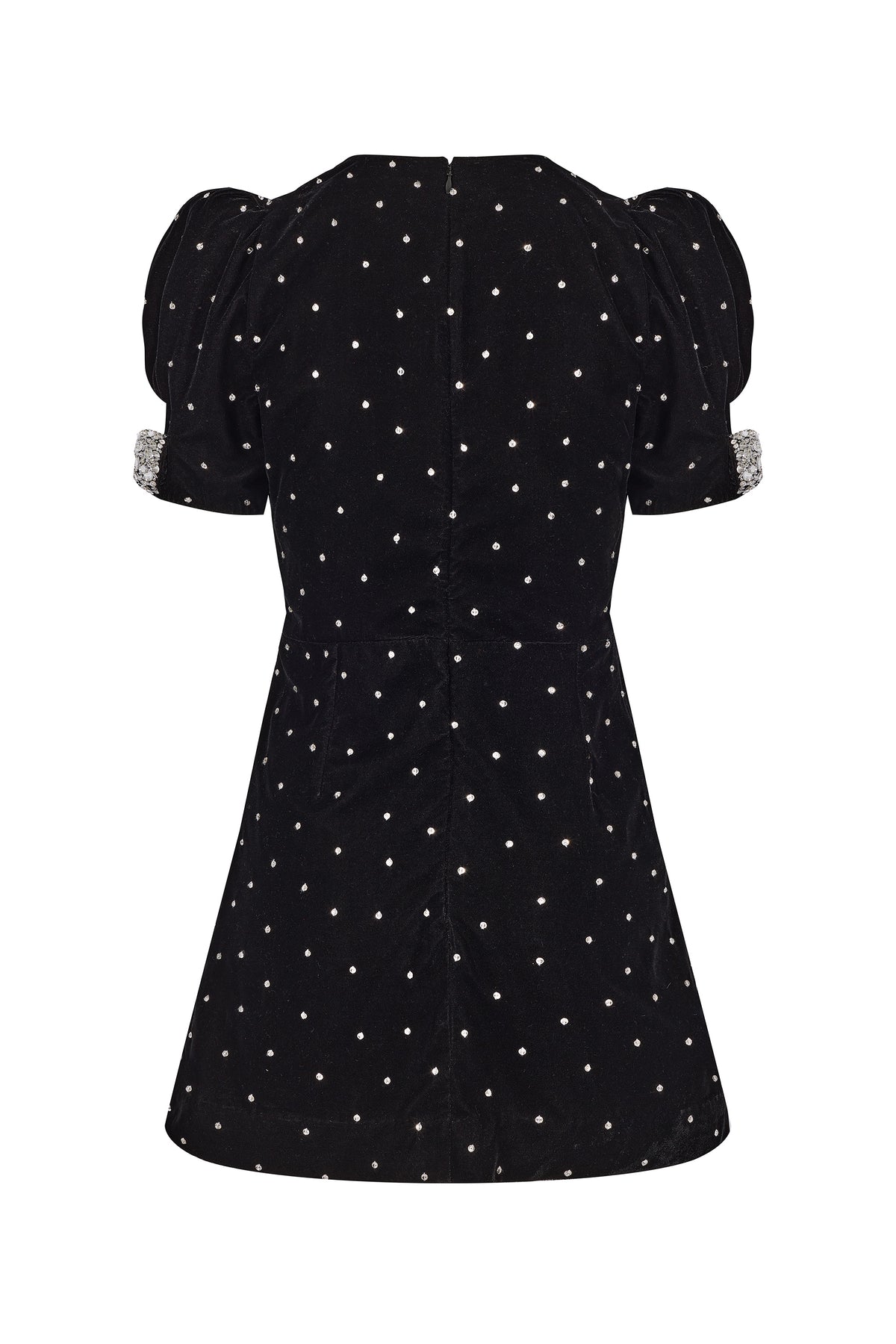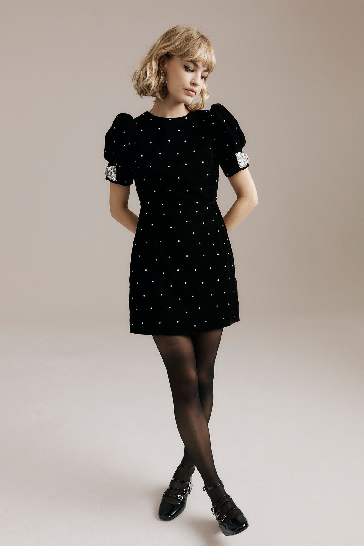 Luna is playfully polished and made to shine. Cut from rich black velvet and scattered with hand-sewn diamantés, she catches the light like a midnight sky. A sculpted shoulder and pleated puff sleeve bring vintage drama, while the embellished half-moon curve at the cuff glints like a secret.