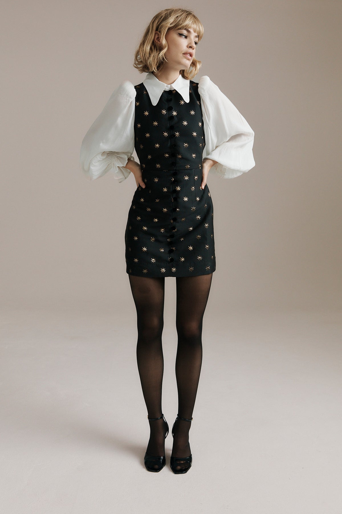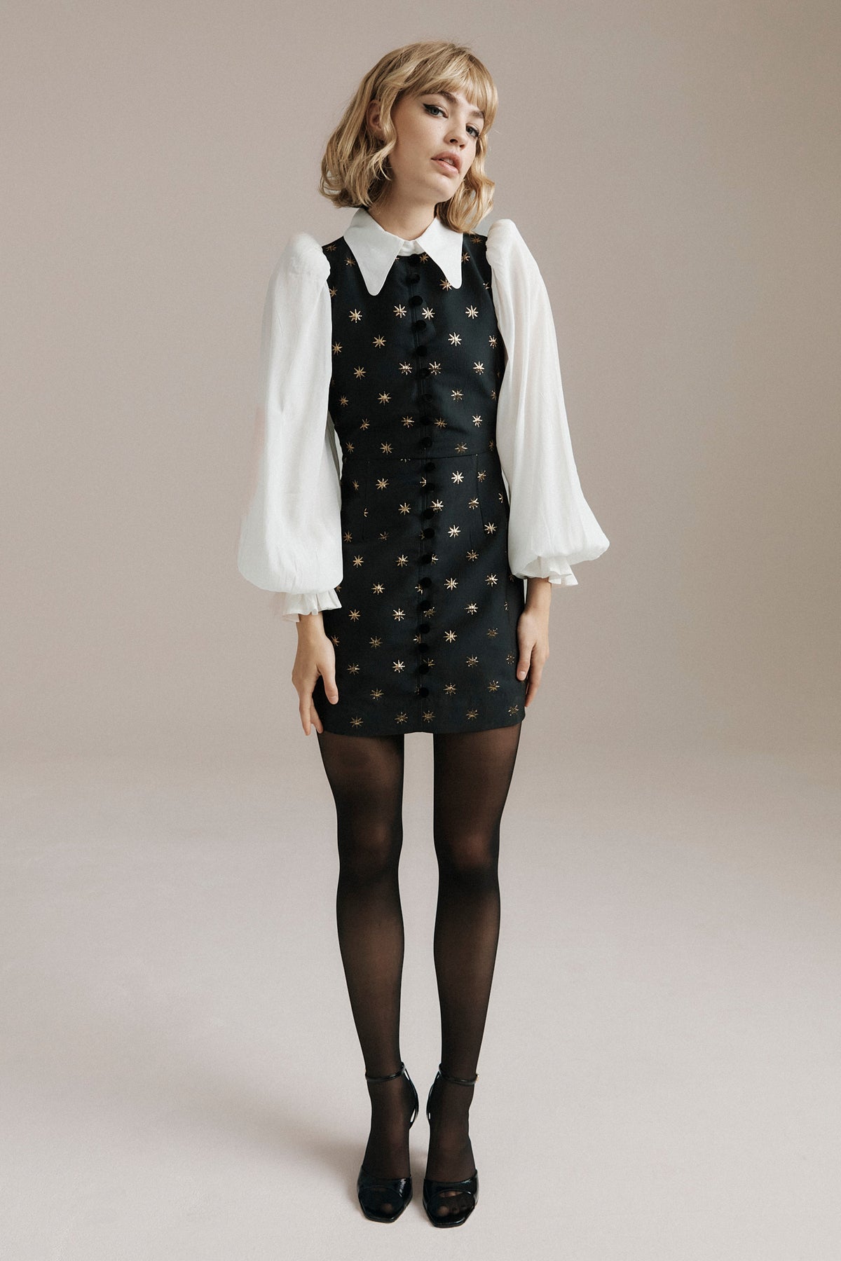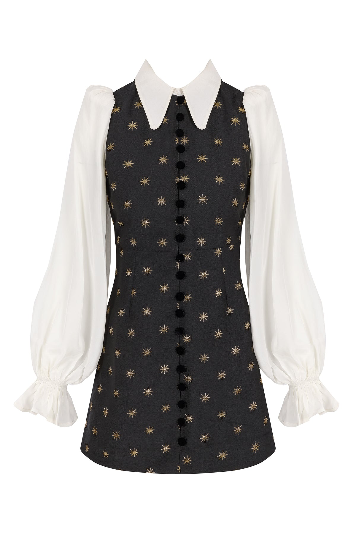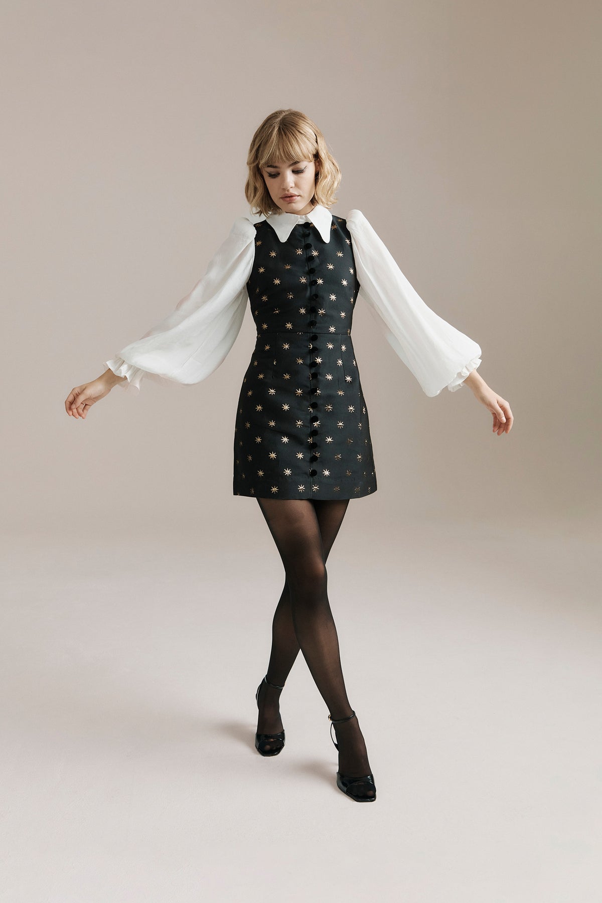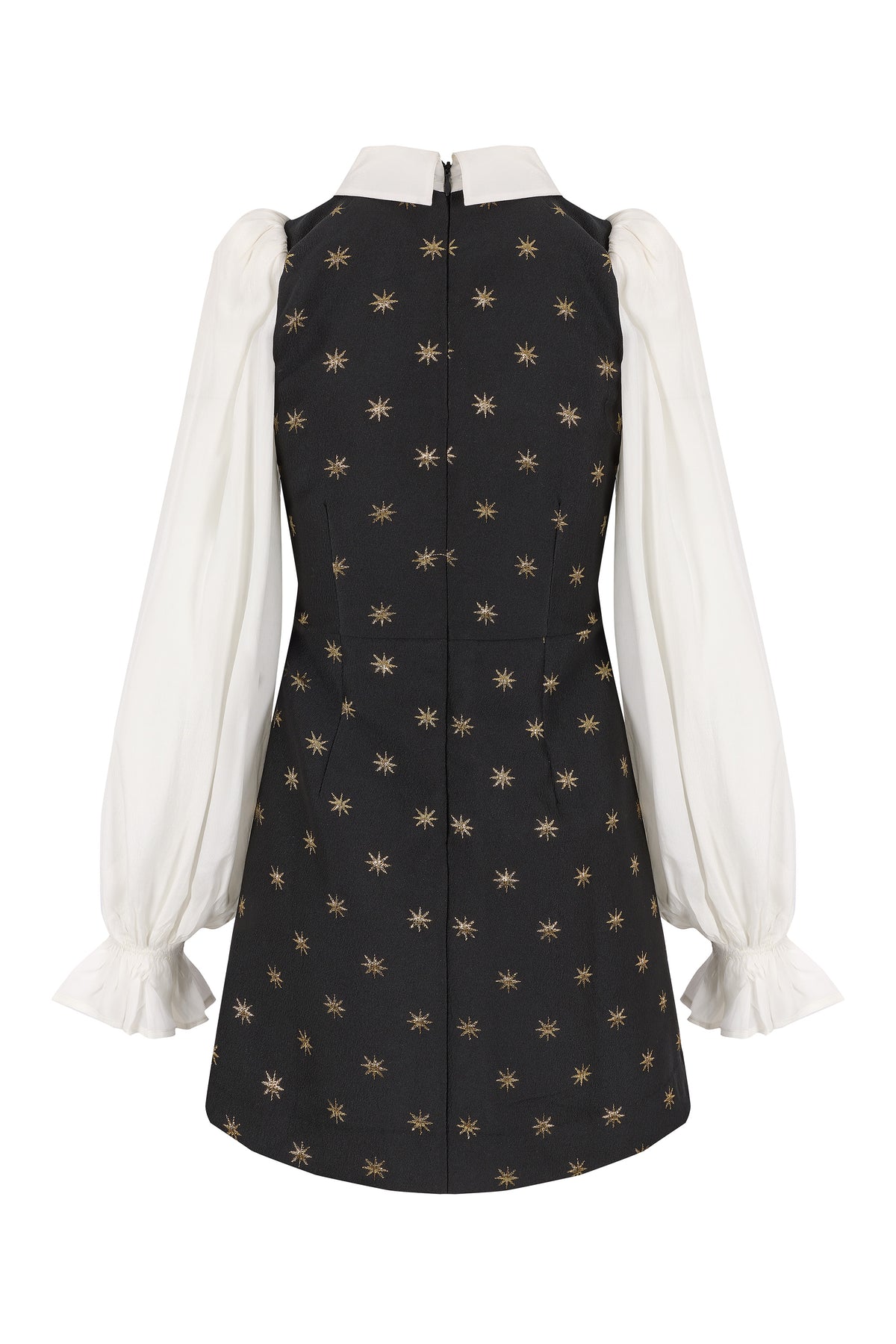 Mari channels the sharp elegance of a 60s Parisian muse, her star-scattered jacquard mini cut close through the body and framed by billowing contrast sleeves. A crisp white collar adds a note of mod precision, while the celestial motif hints at midnight wanderings along the Seine.