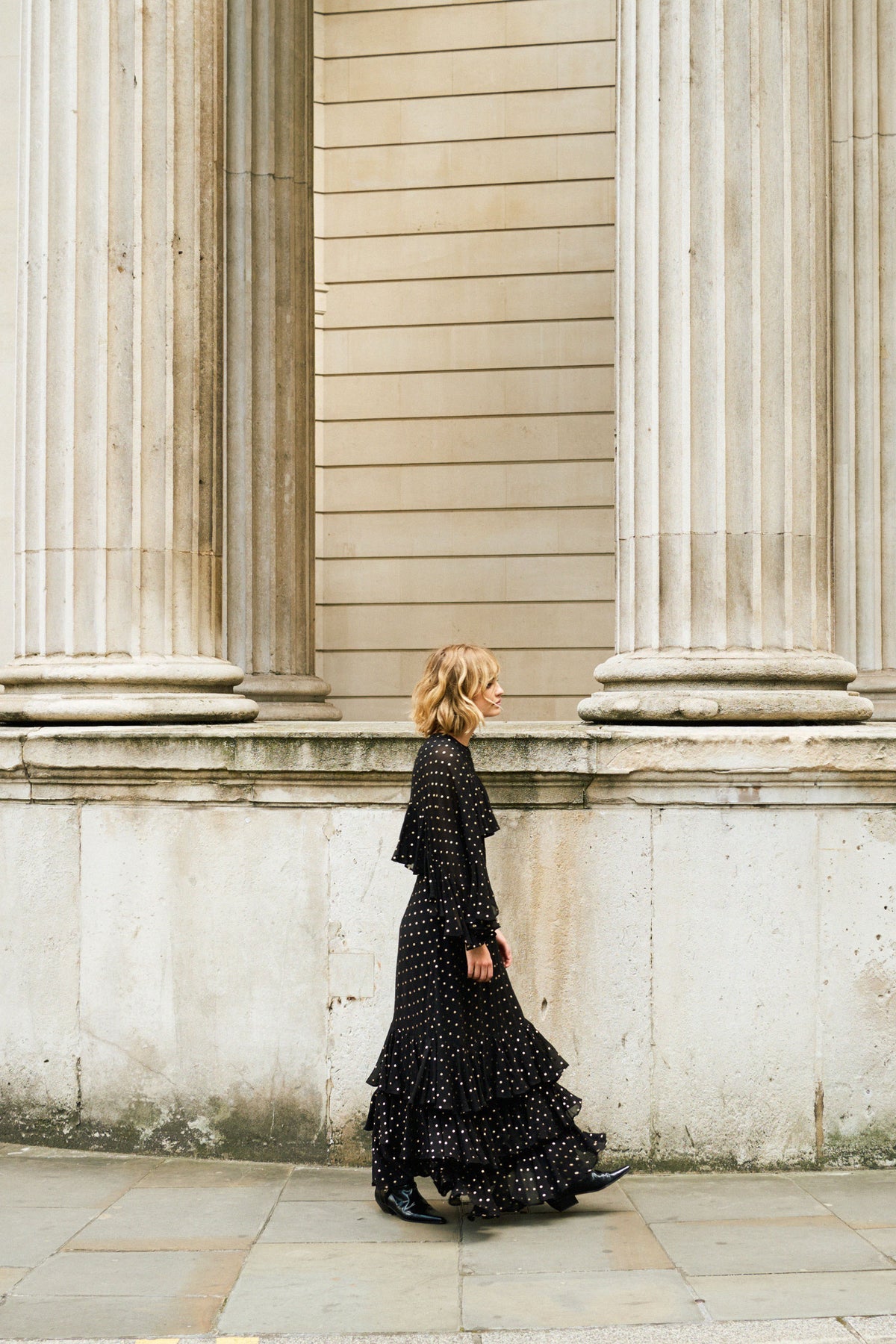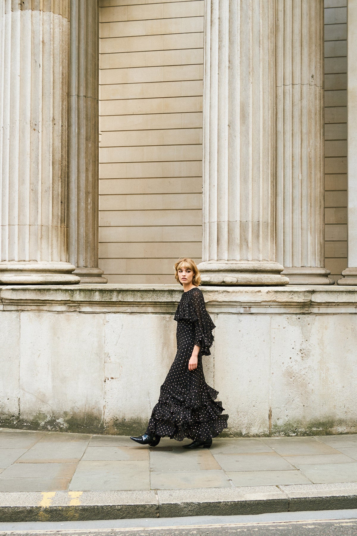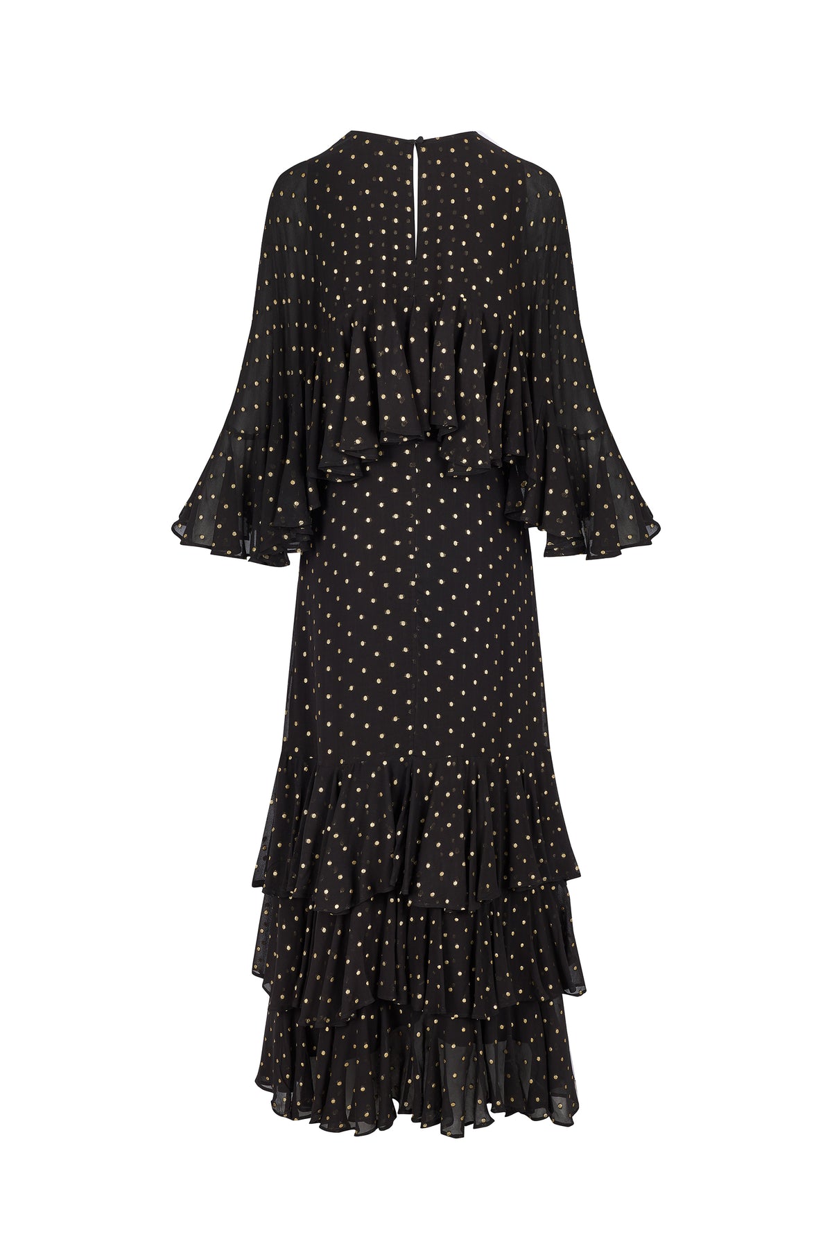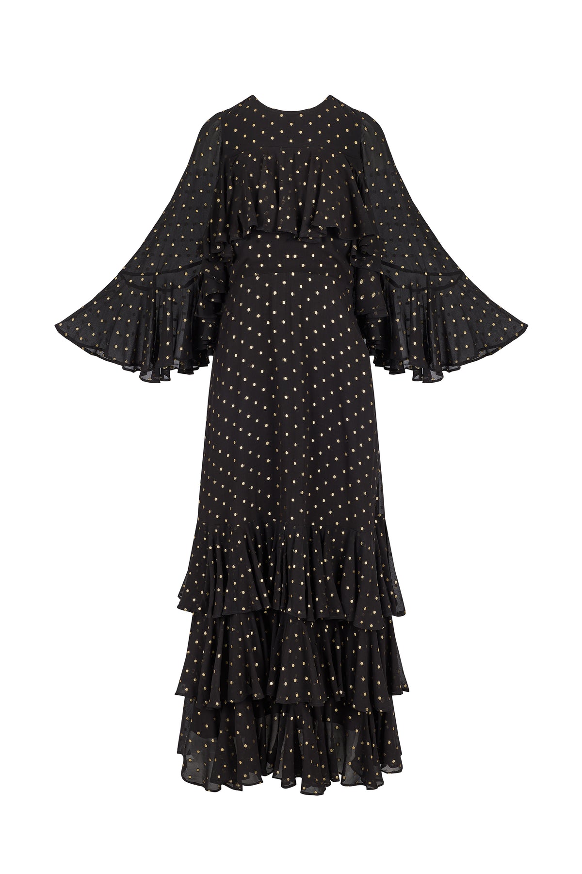 Petula is pure evening drama. A floor-sweeping silhouette in gauzy black chiffon, scattered with twinkling gold lurex polka dots that catch the light with every step. A soft cape overlay drapes over the shoulders, while the fluted sleeves and cascading ruffles create movement with cinematic flair.