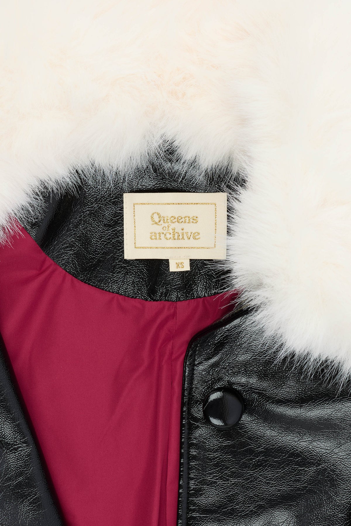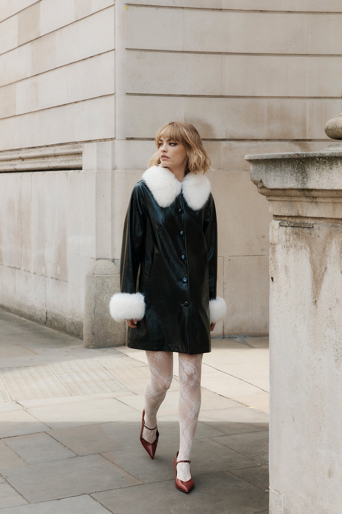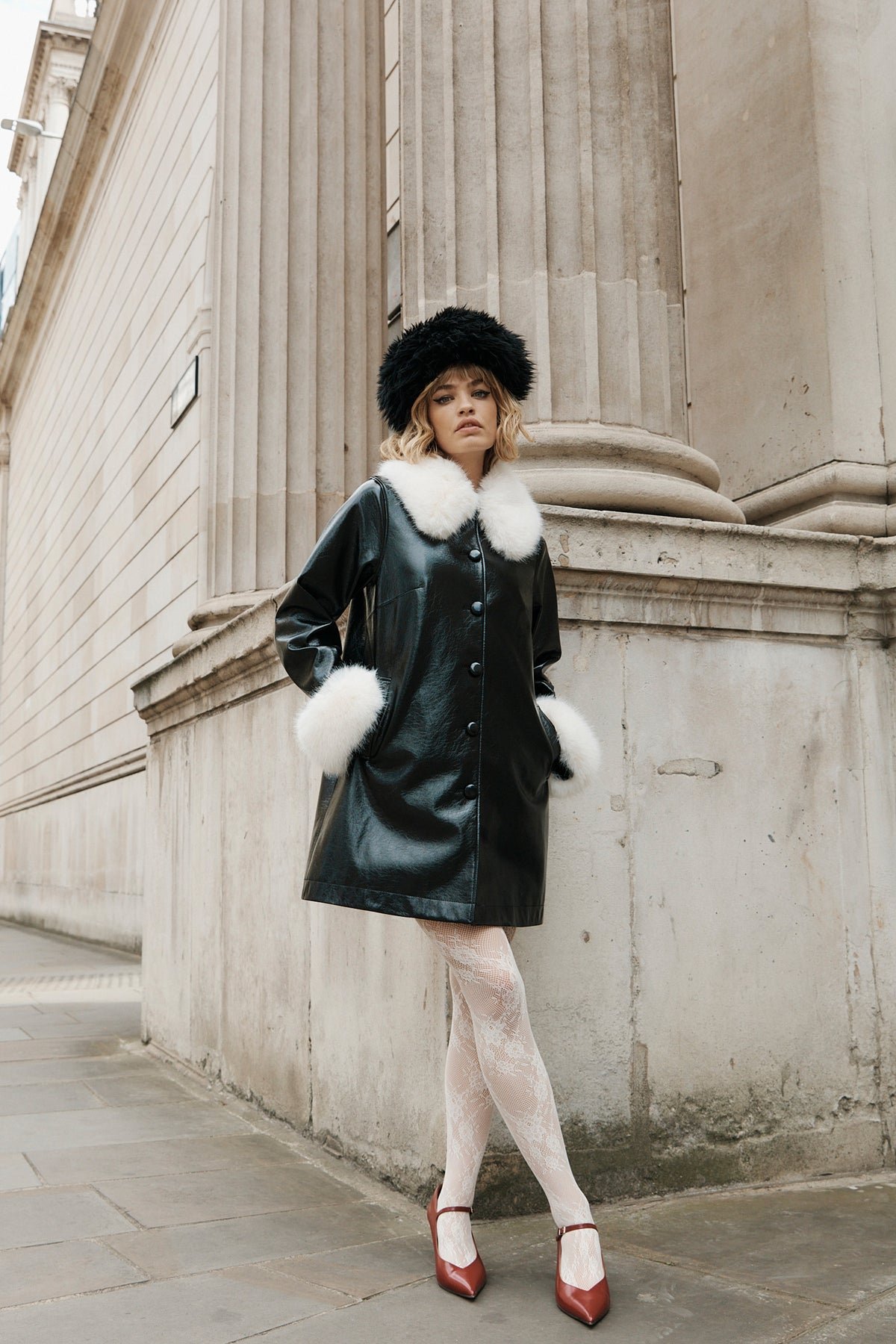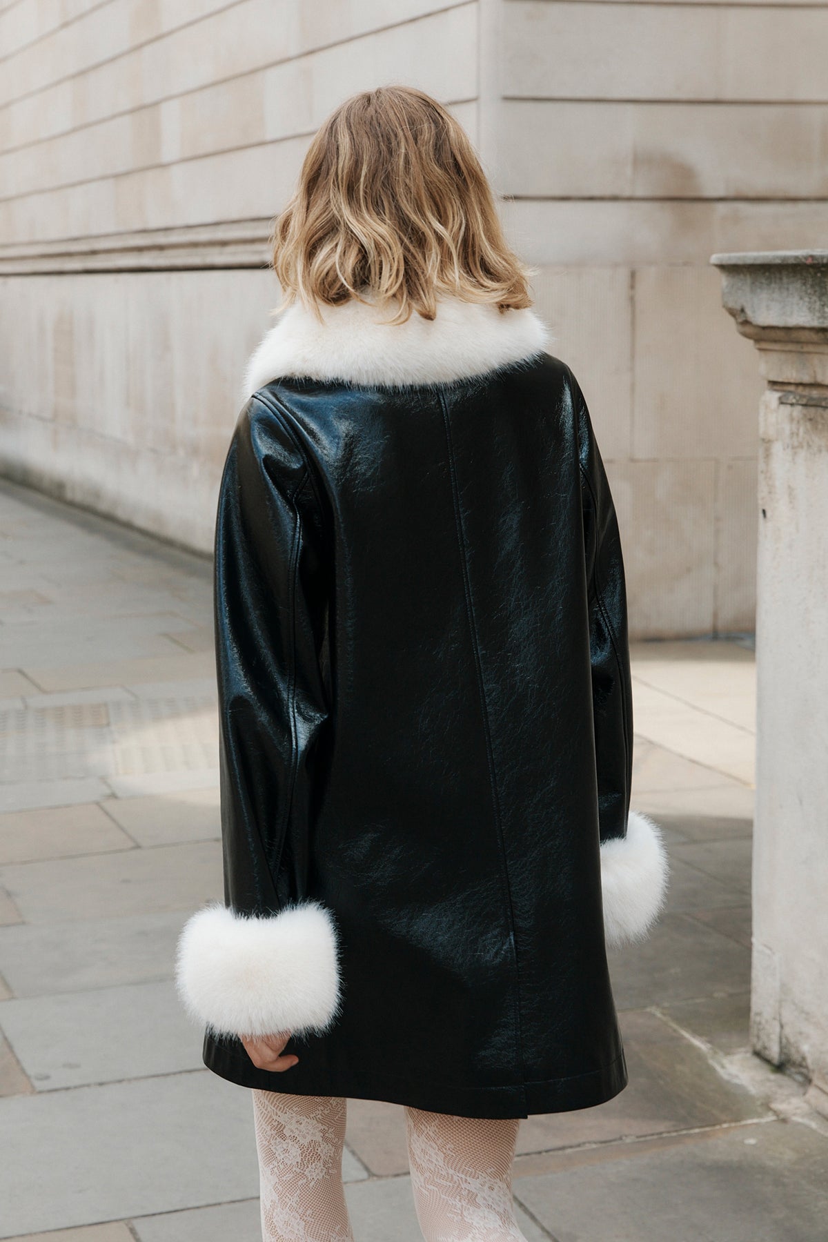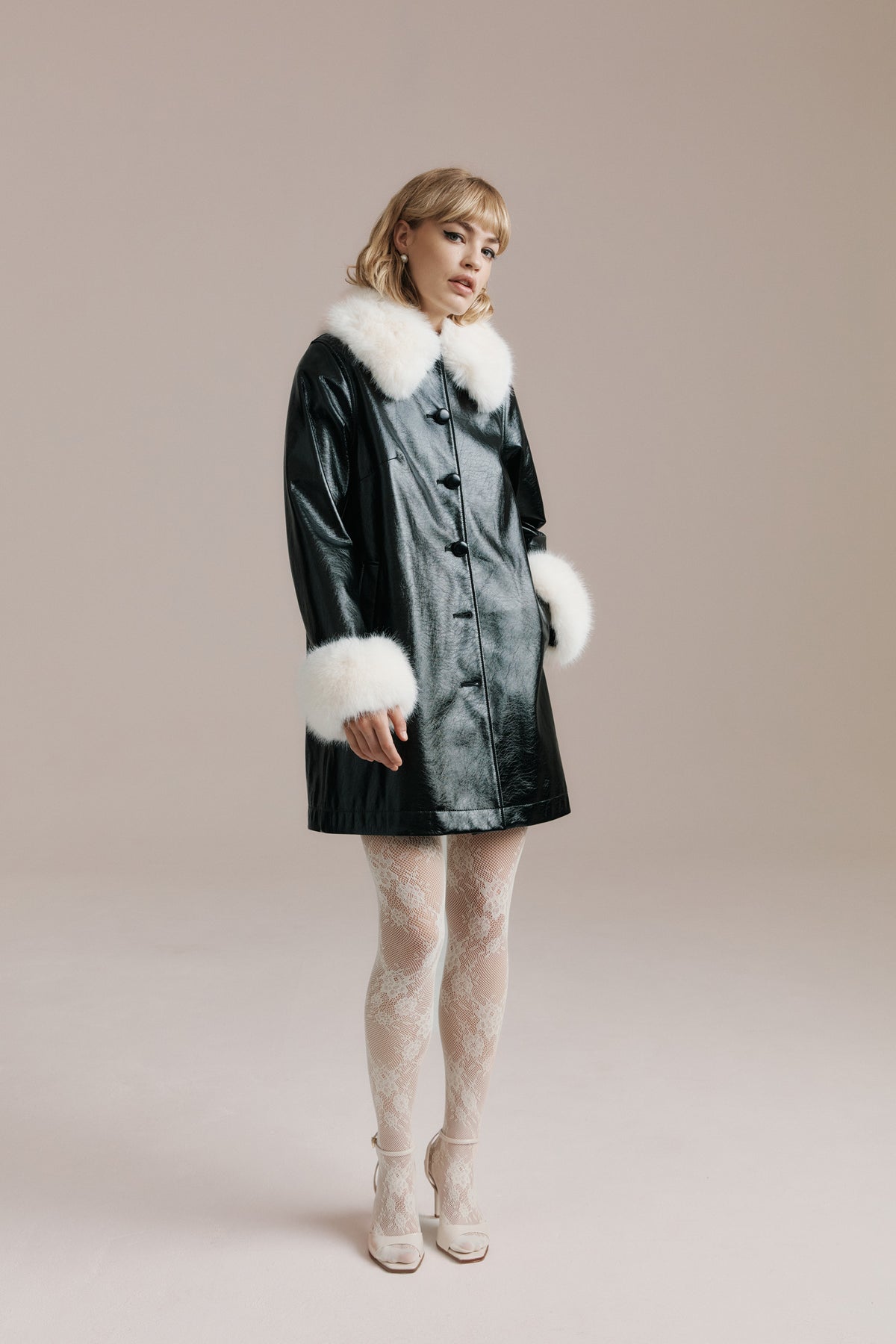 Stella is bold, retro, and utterly iconic, a statement coat that channels serious 60s It-girl energy. Cut in black crackle vinyl and trimmed with plush white faux fur at the collar and cuffs, it brings drama, nostalgia, and a wink of rebellion to winter dressing.