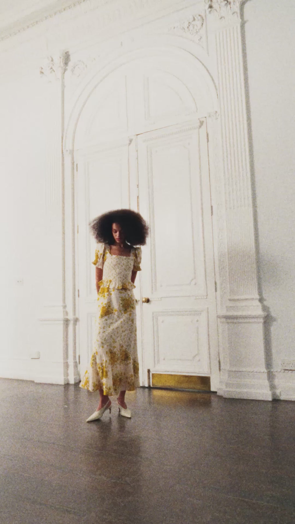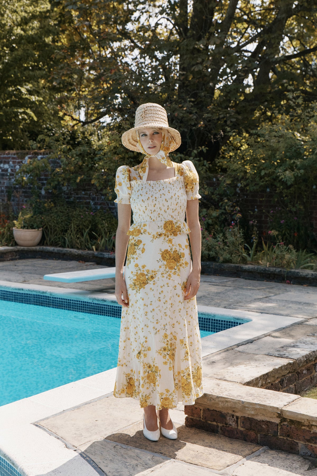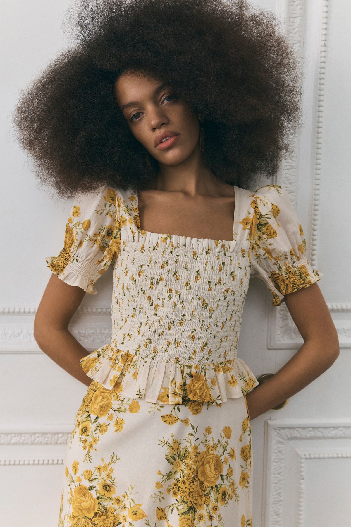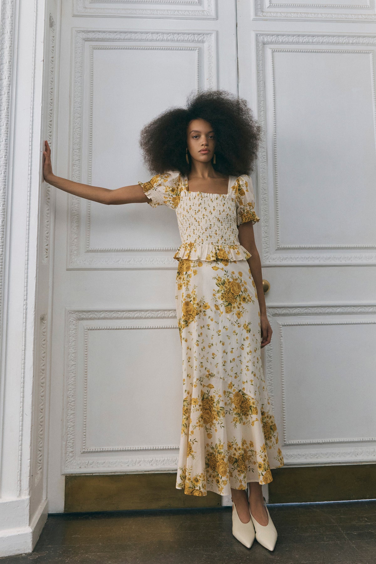 Her softly smocked bodice contours the frame with gentle structure, balanced by puffed sleeves that sit proudly at the shoulder. A subtle peplum shapes the waist before giving way to a chevron tiered skirt, where differing scales of print create quiet depth and movement.
