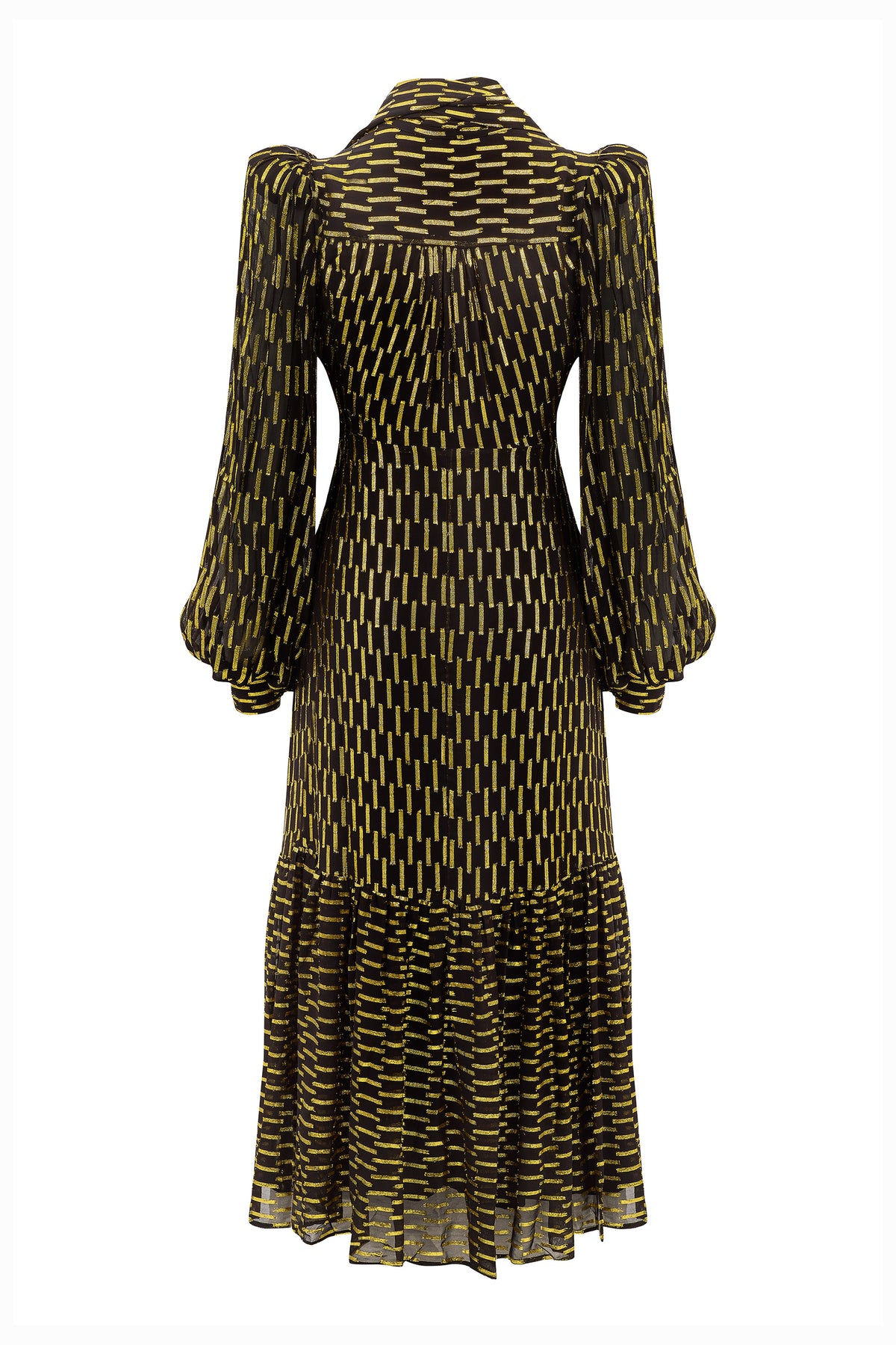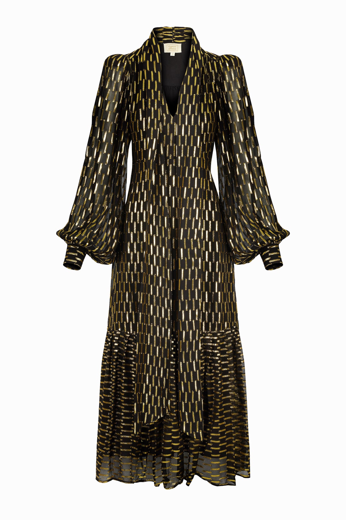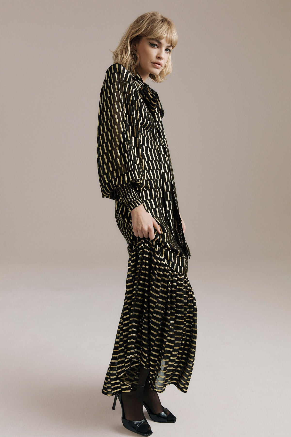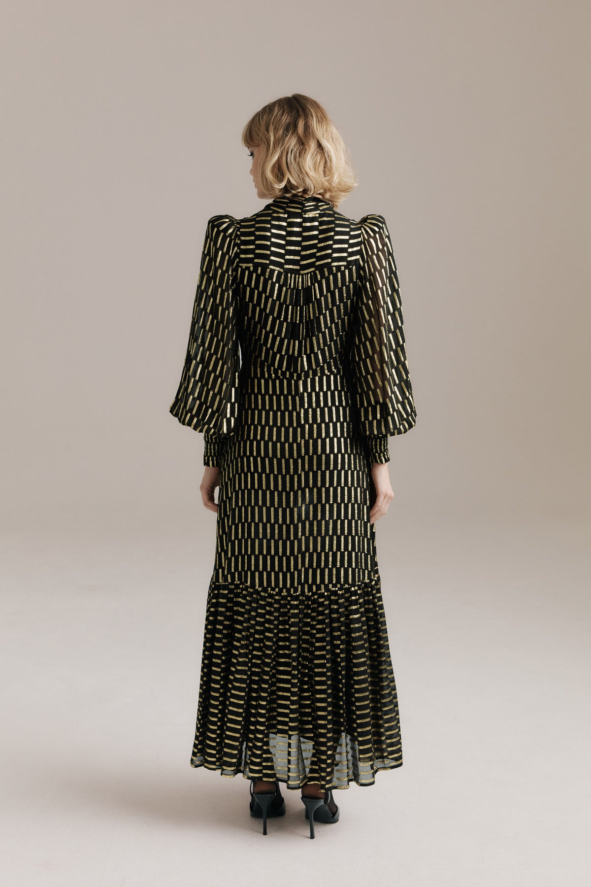 Alabama moves with the fluid ease of a seventies muse, her black chiffon threaded with glints of gold lurex that catch the light like conversation in the hush before midnight. Billowing sleeves, a softly tied neck, and a sweeping hemline create a silhouette that drifts between elegance and allure.