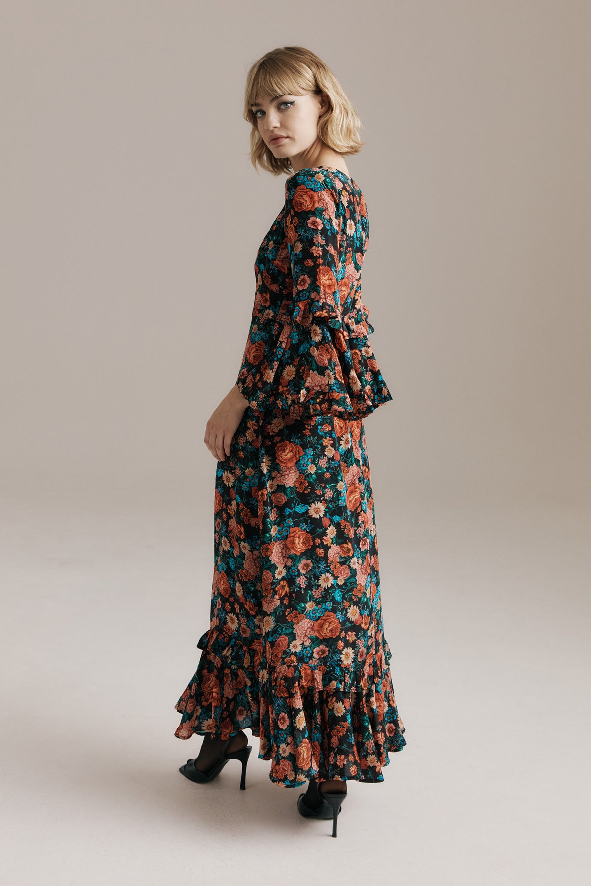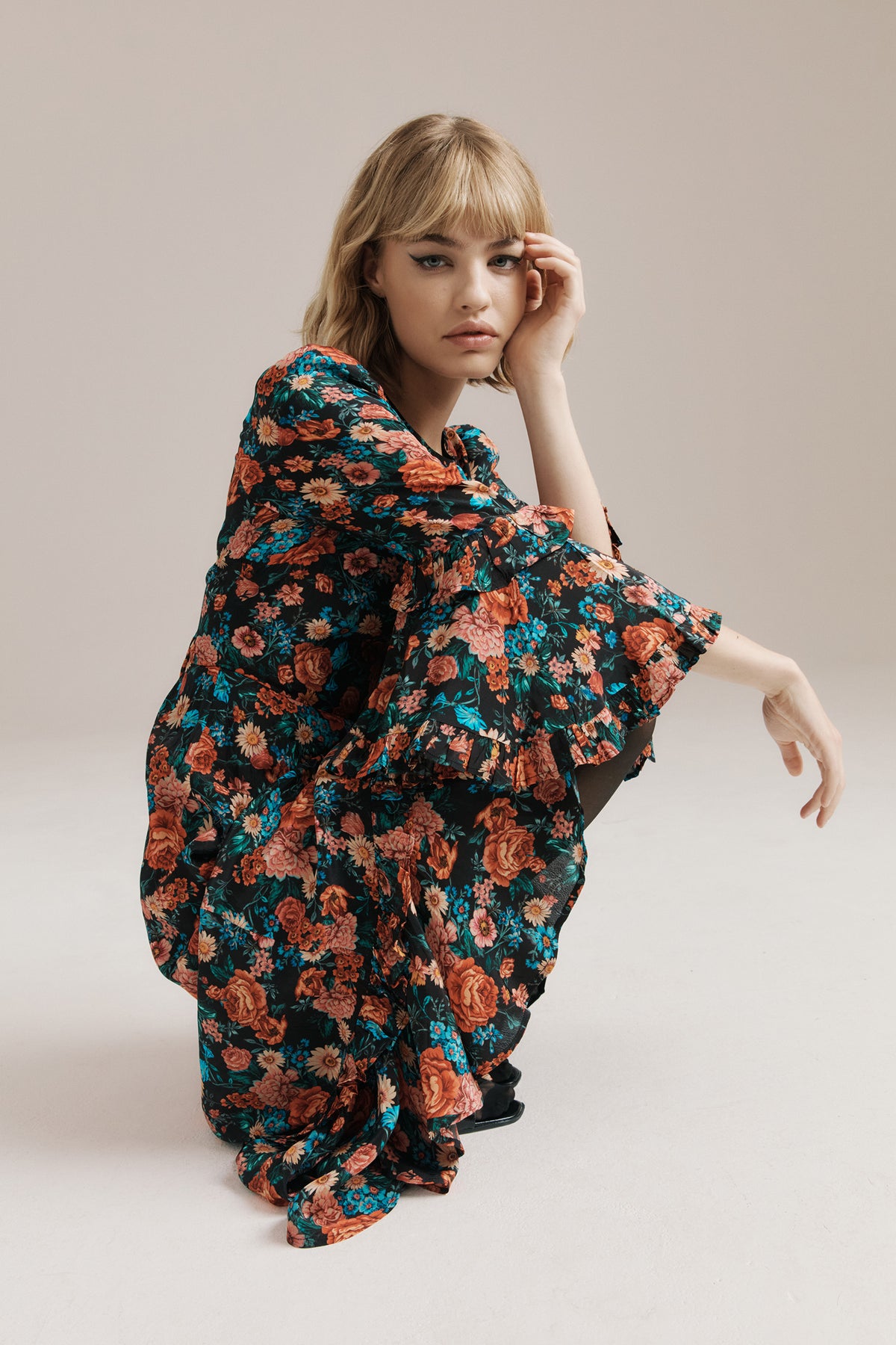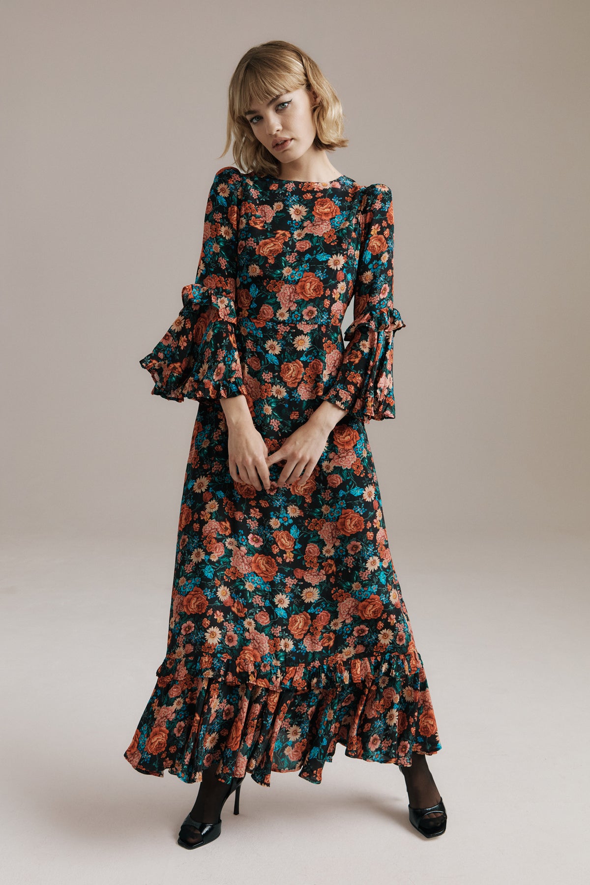 Claudia drapes the body in a cascade of vintage-inspired florals, her fluted sleeves and signature structured shoulders creating instant drama. The cut is masterfully considered, skimming the figure in all the right places before falling into a tiered, ruffled hem that moves with generous sway.