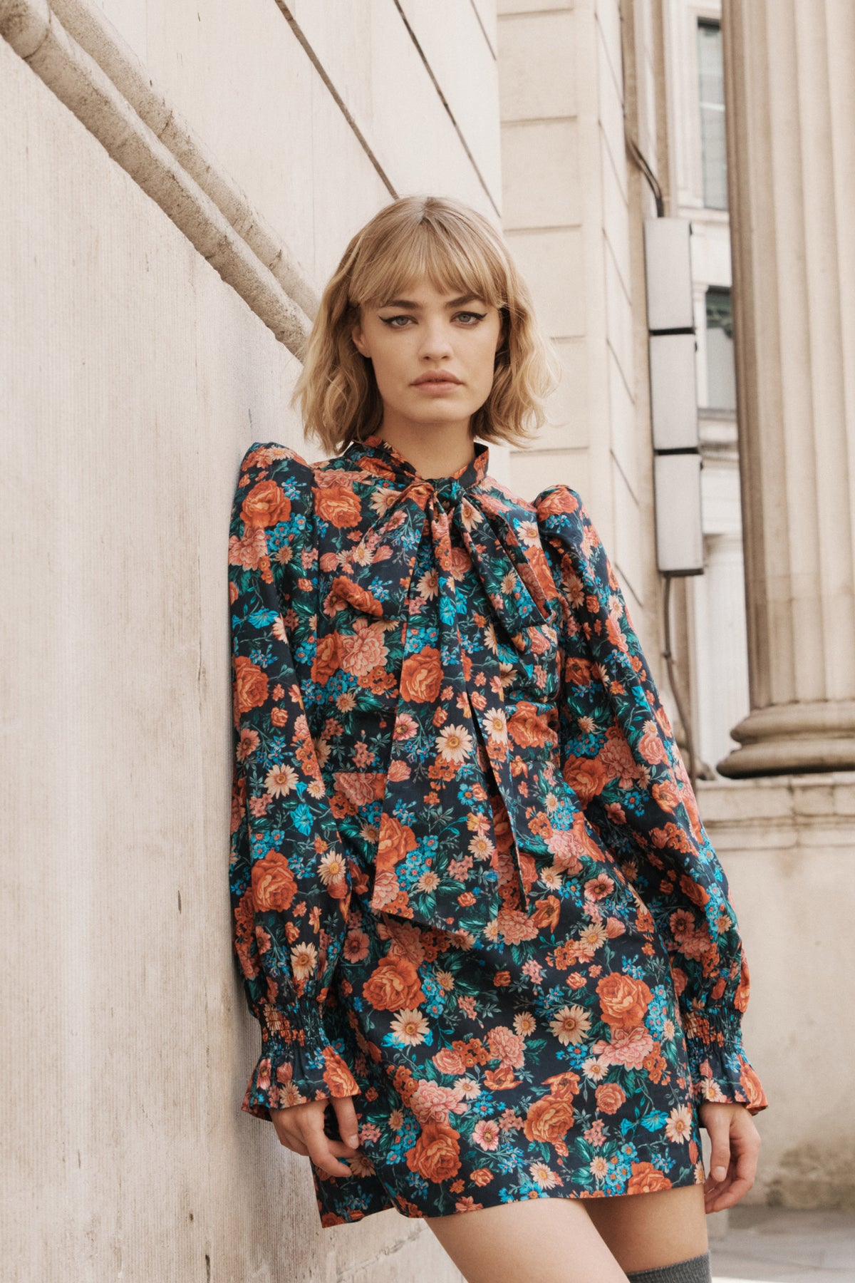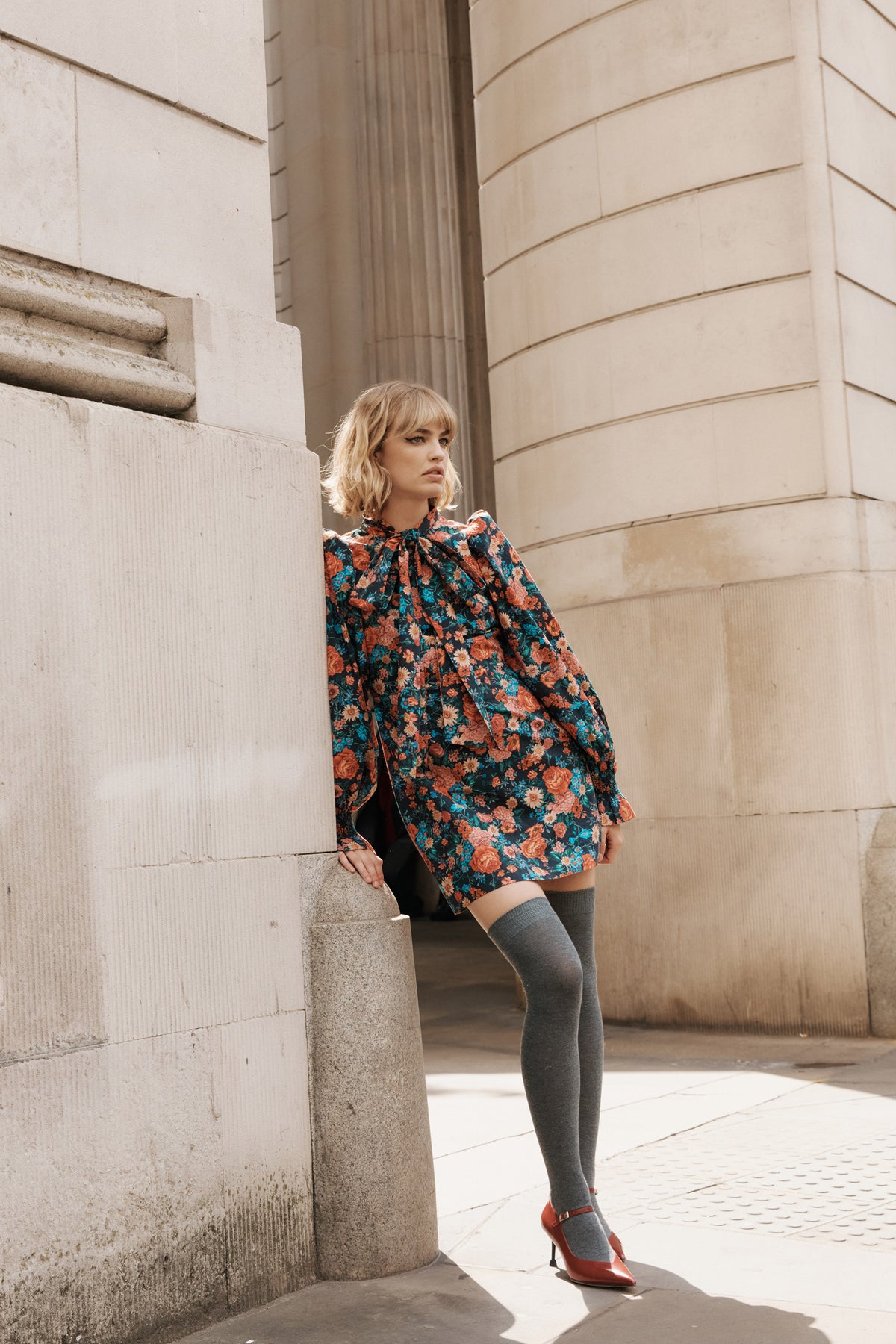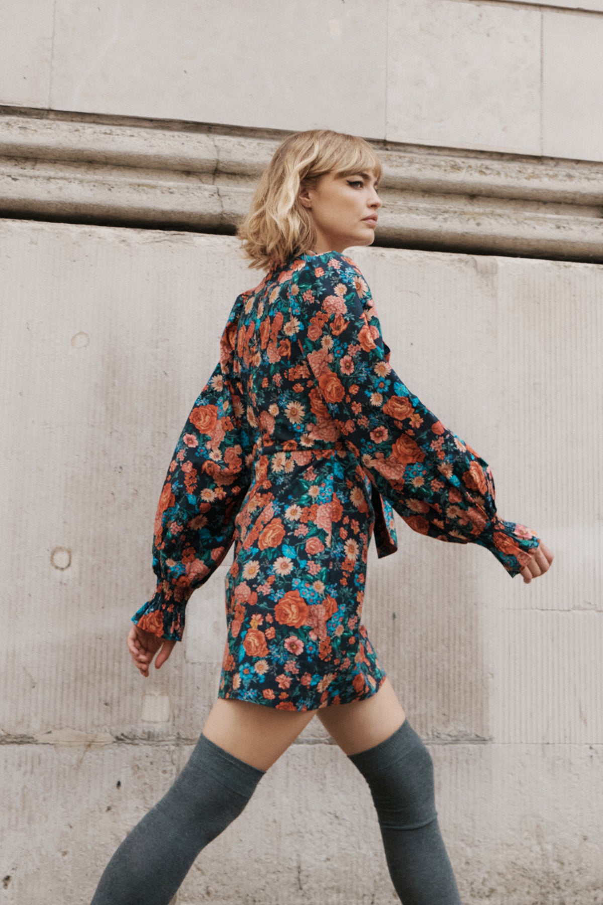 Joan is a 70s muse reimagined for Paris in the cool season, her vivid winter florals lighting up the boulevards. Signature structured shoulders and billowing sleeves create drama from every angle, while the tie-neck frames her face with insouciant charm.