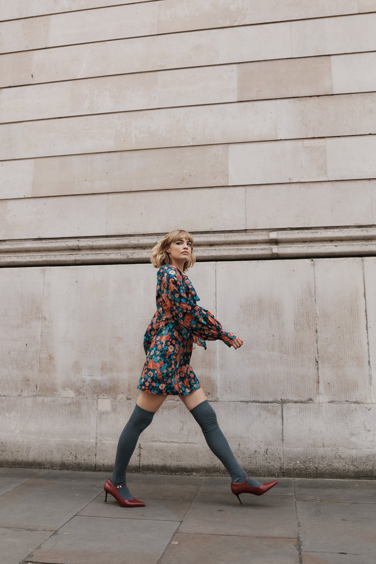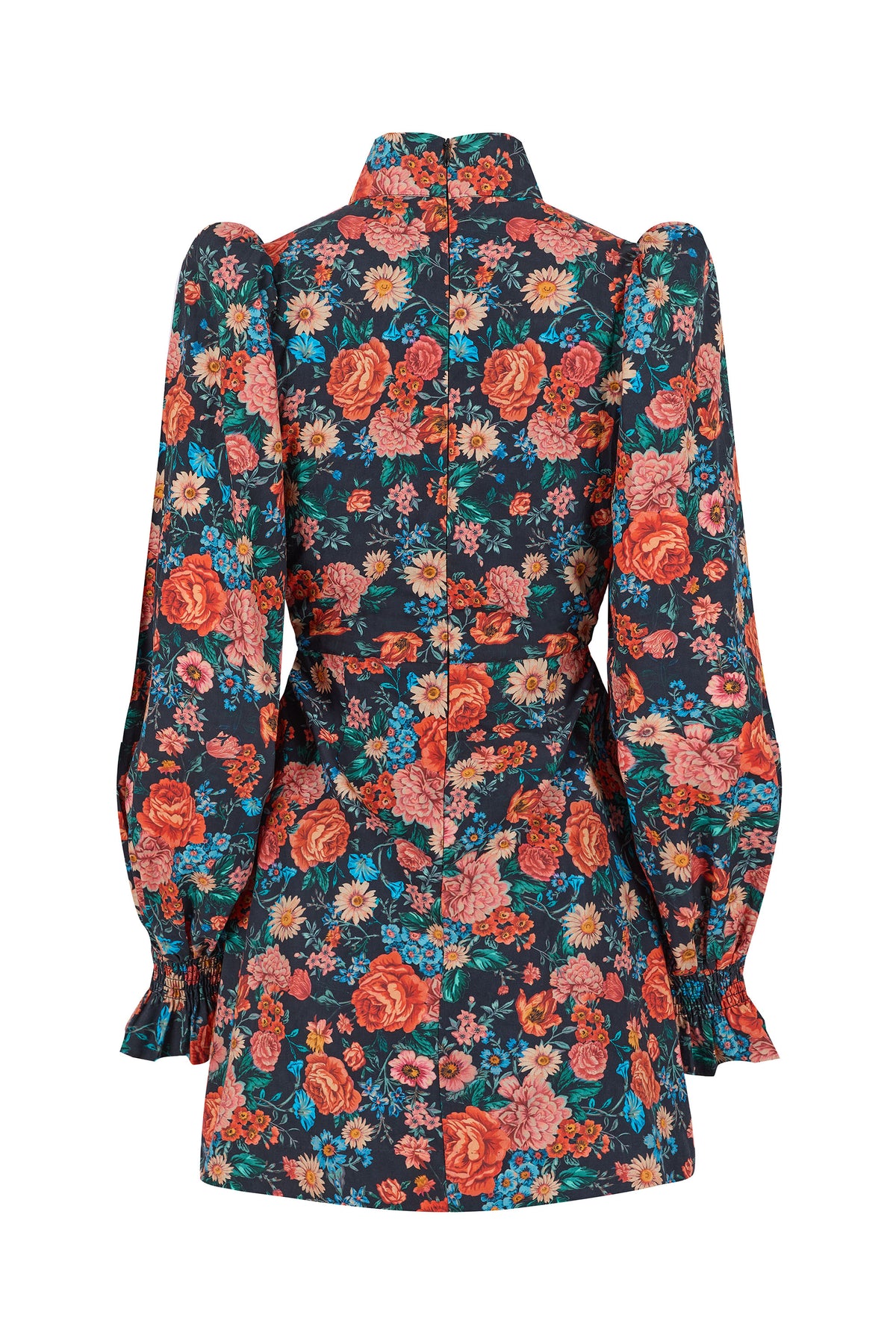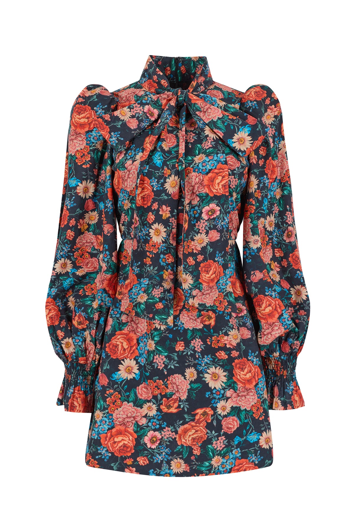 Joan is a 70s muse reimagined for Paris in the cool season, her vivid winter florals lighting up the boulevards. Signature structured shoulders and billowing sleeves create drama from every angle, while the tie-neck frames her face with insouciant charm.
