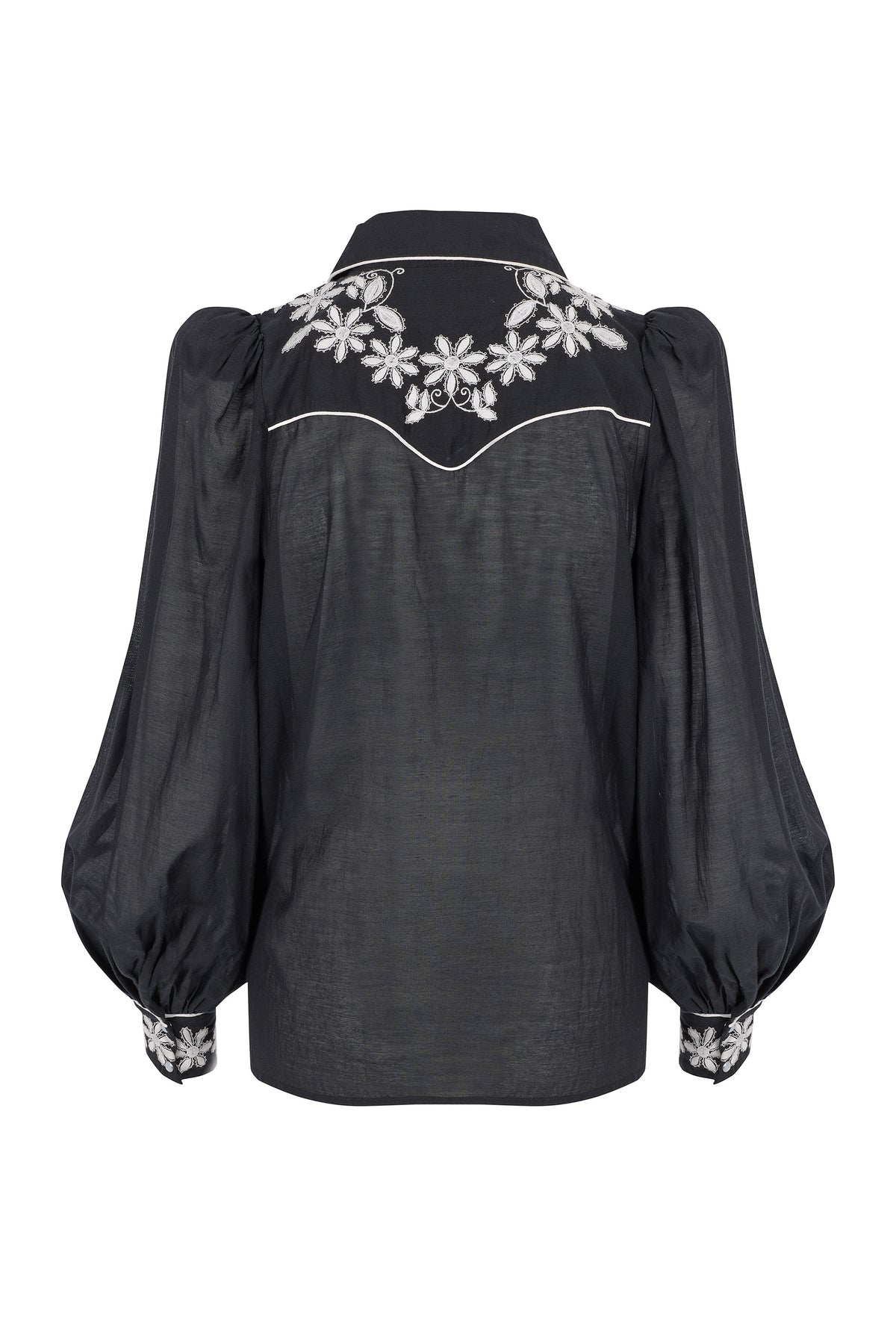 Cut in inky black and traced with contrast piping, she is adorned with hand embroidered blooms at the collar and cuffs, each one a testament to craftsmanship, stitched with artistry.