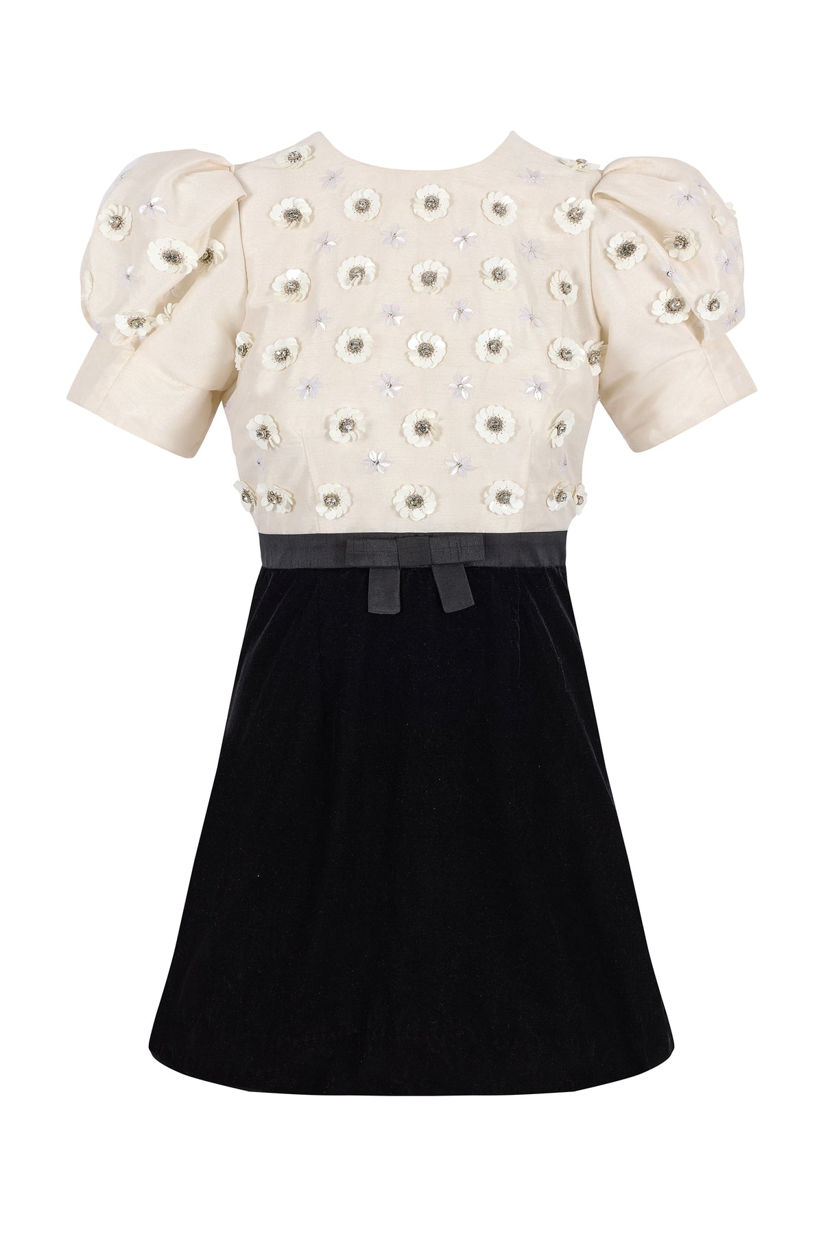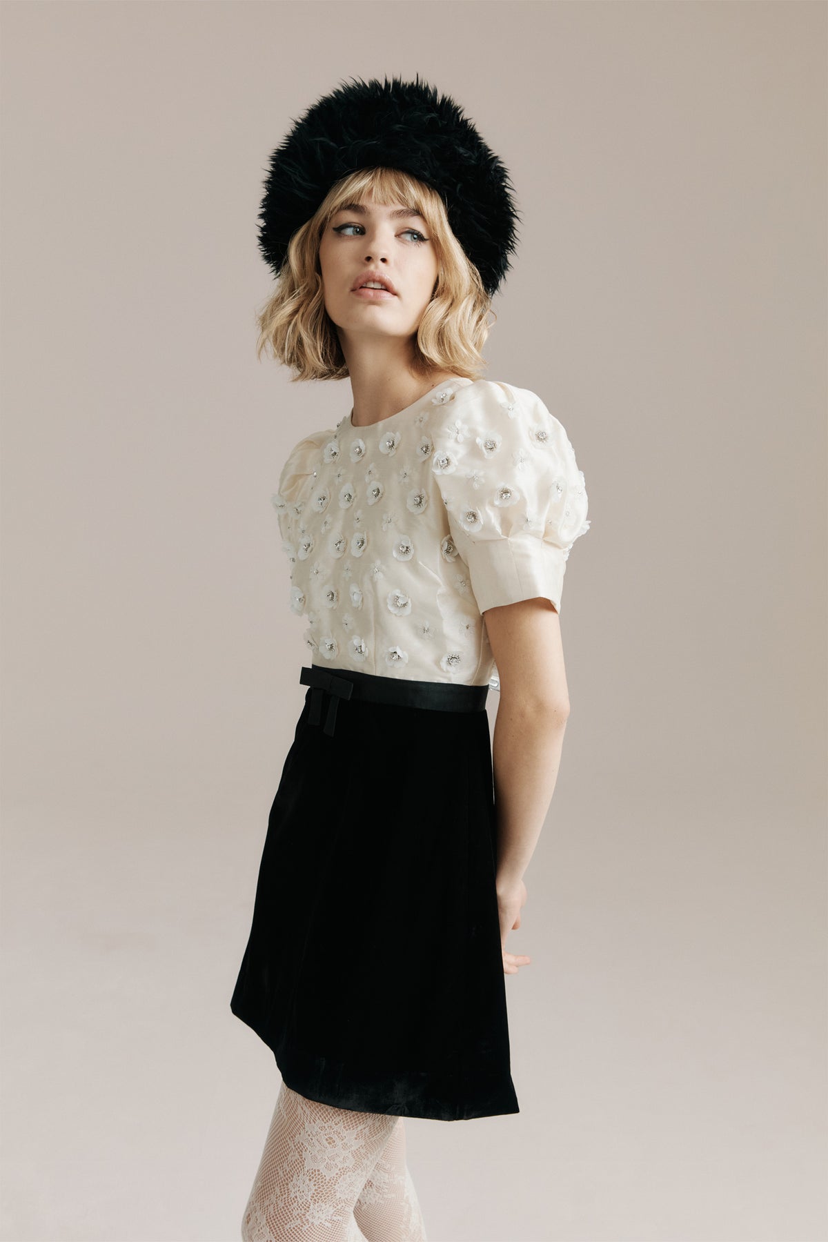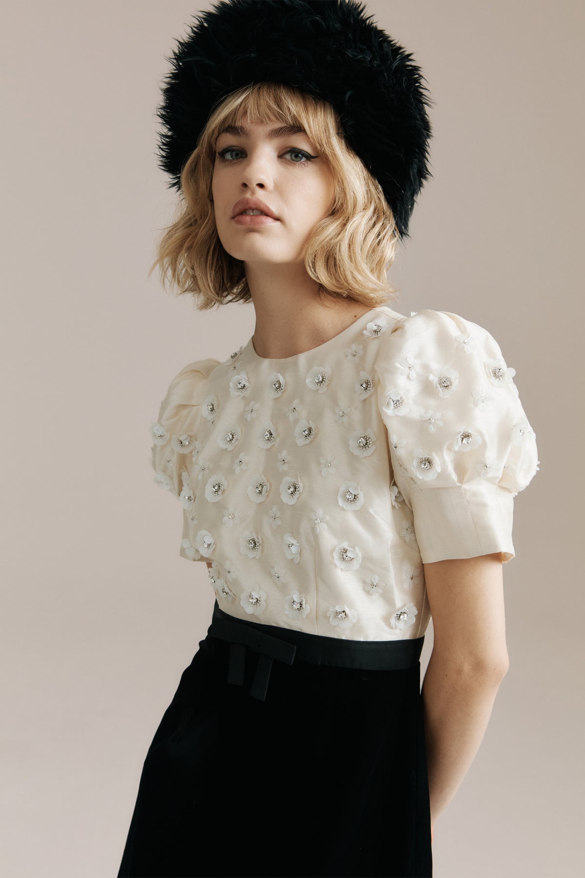Ophelia is a study in contrasts, the softness of luminous ivory dupion scattered with hand-stitched florals against the depth of inky black velvet. Sweet but assured, she blends ingénue charm with the quiet confidence of a 60s It-girl.