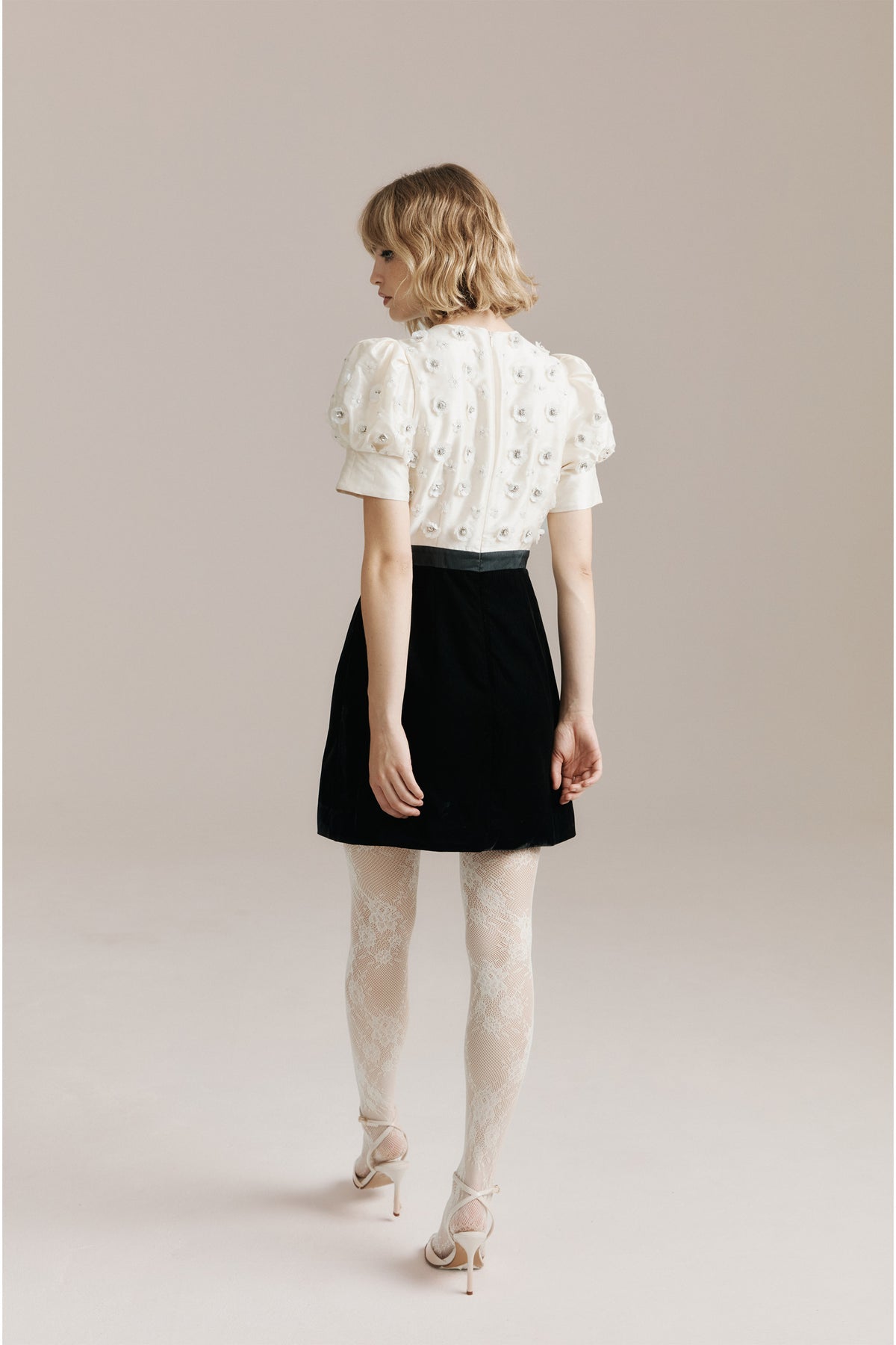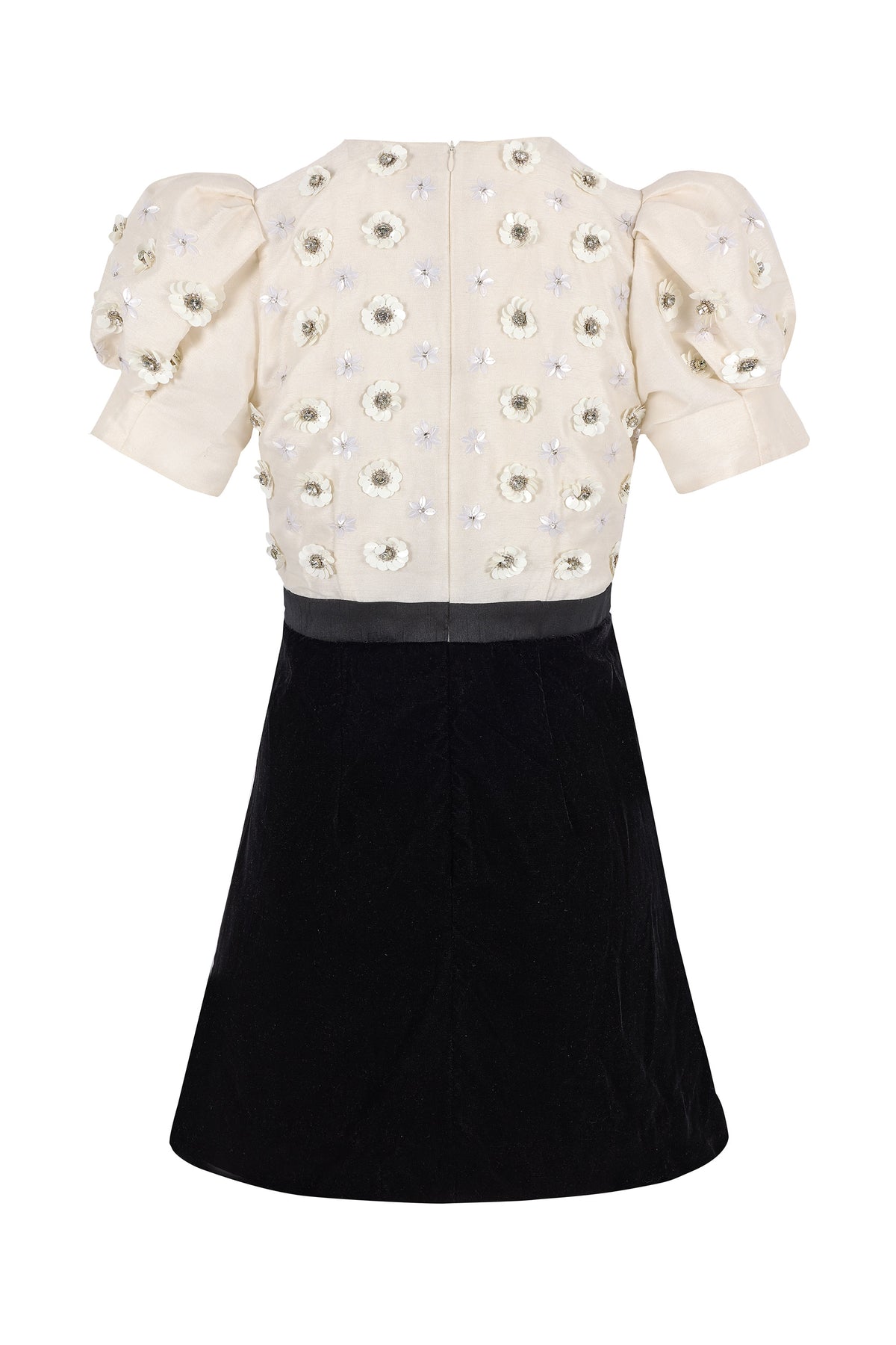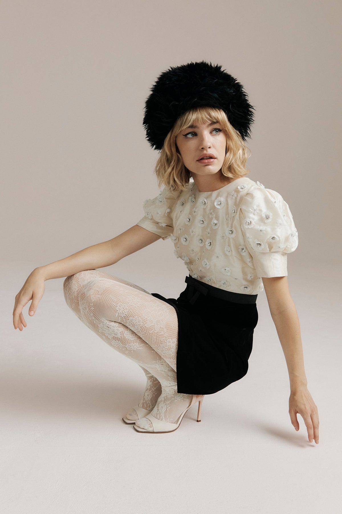Ophelia is a study in contrasts, the softness of luminous ivory dupion scattered with hand-stitched florals against the depth of inky black velvet. Sweet but assured, she blends ingénue charm with the quiet confidence of a 60s It-girl.