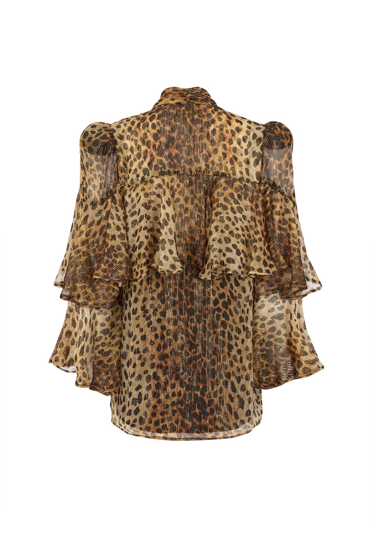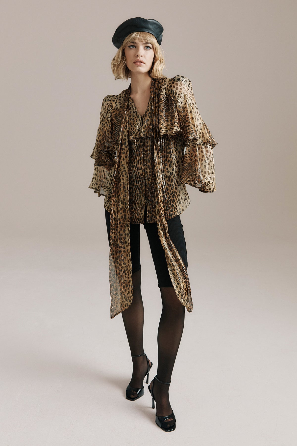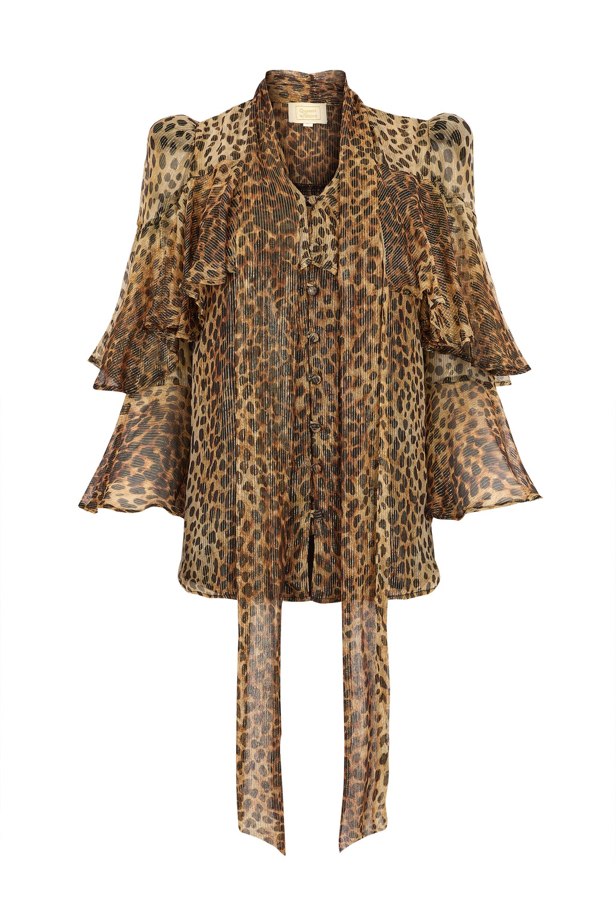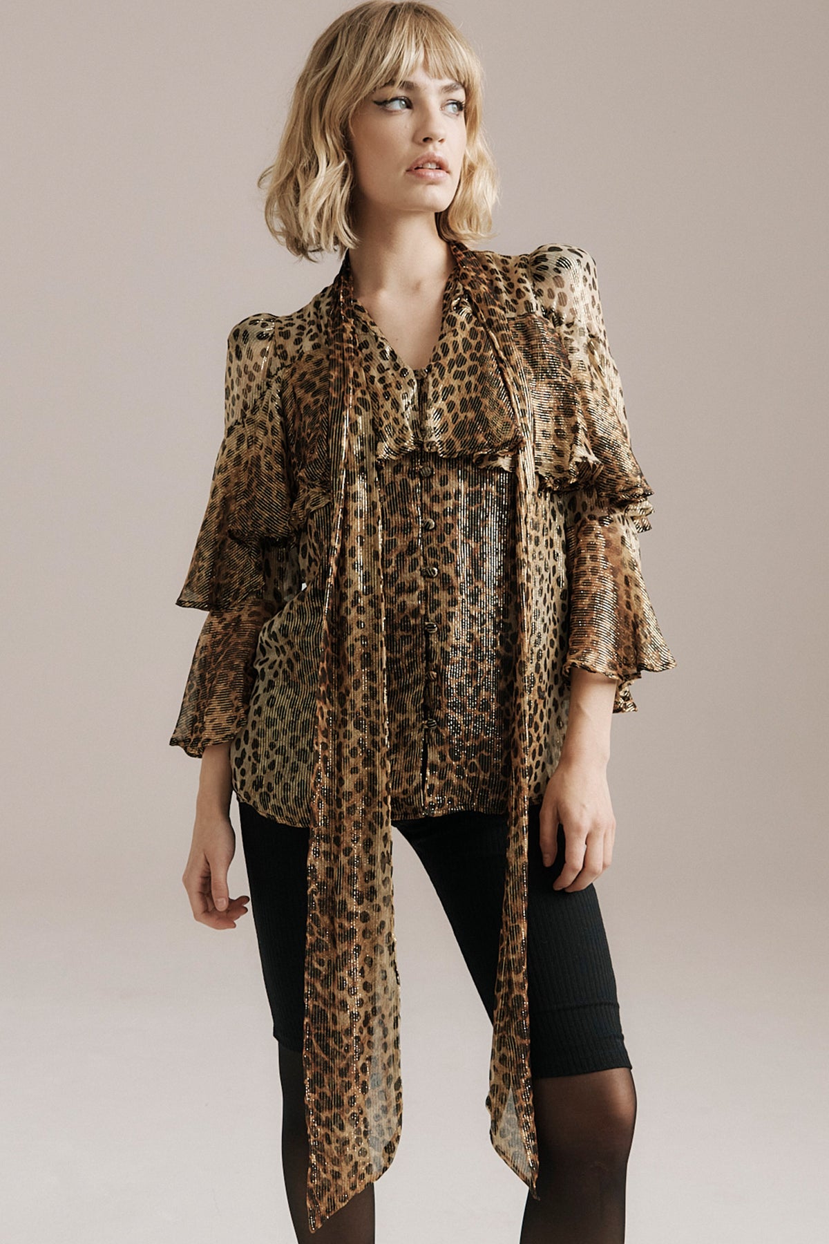 Bea combines the decadent energy of Studio 54 with unapologetic feminine flair. Crafted from sheer lurex chiffon in a bold cheetah print, the fabric catches the light with a soft, sultry shimmer. Softly gathered sleeves, cascading frills and an elongated necktie conjure vintage drama with a sense of playful confidence.