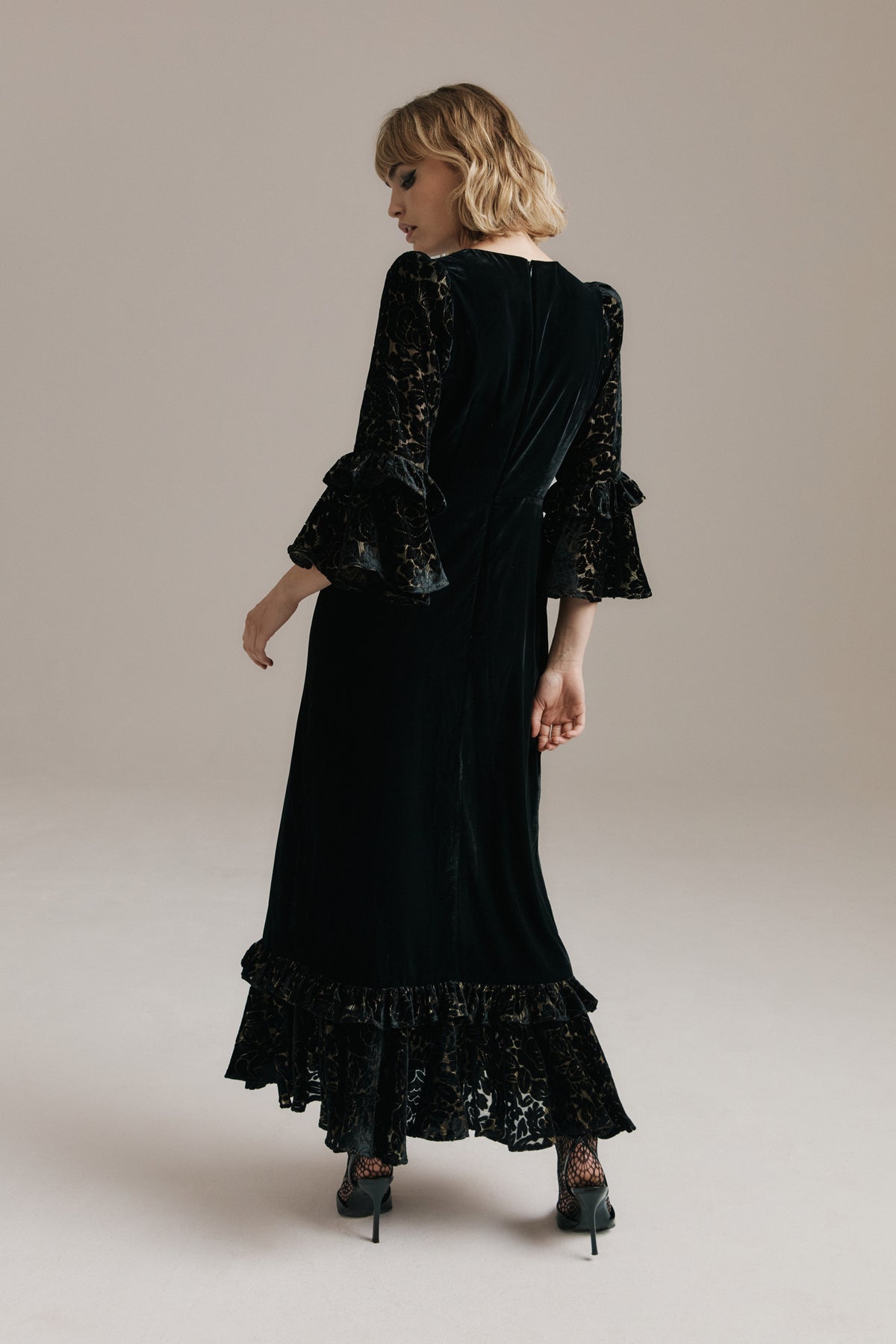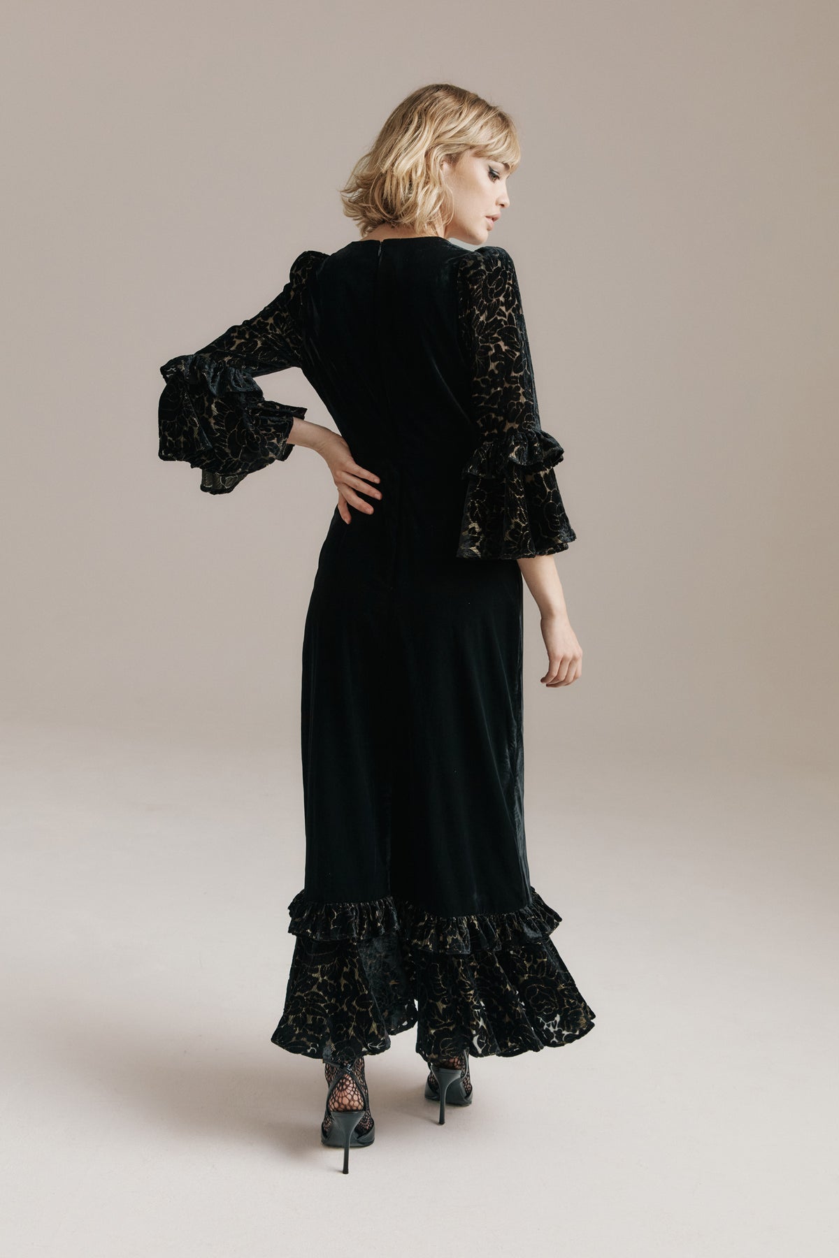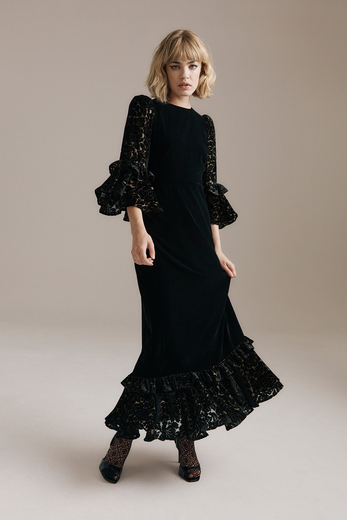 Rosa brings a refined winter glamour. Cut from deep black velvet, she skims the figure with quiet elegance before falling into a sweeping ruffled hem. Her sleeves and hem are crafted in floral devoré velvet, the pattern lined with fine gold lurex that catches the light like tiny winter sparks.