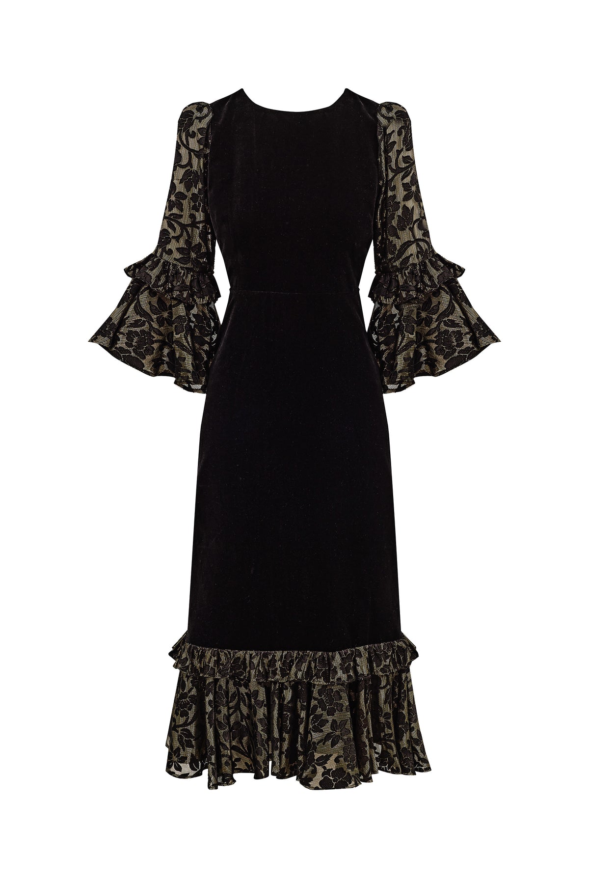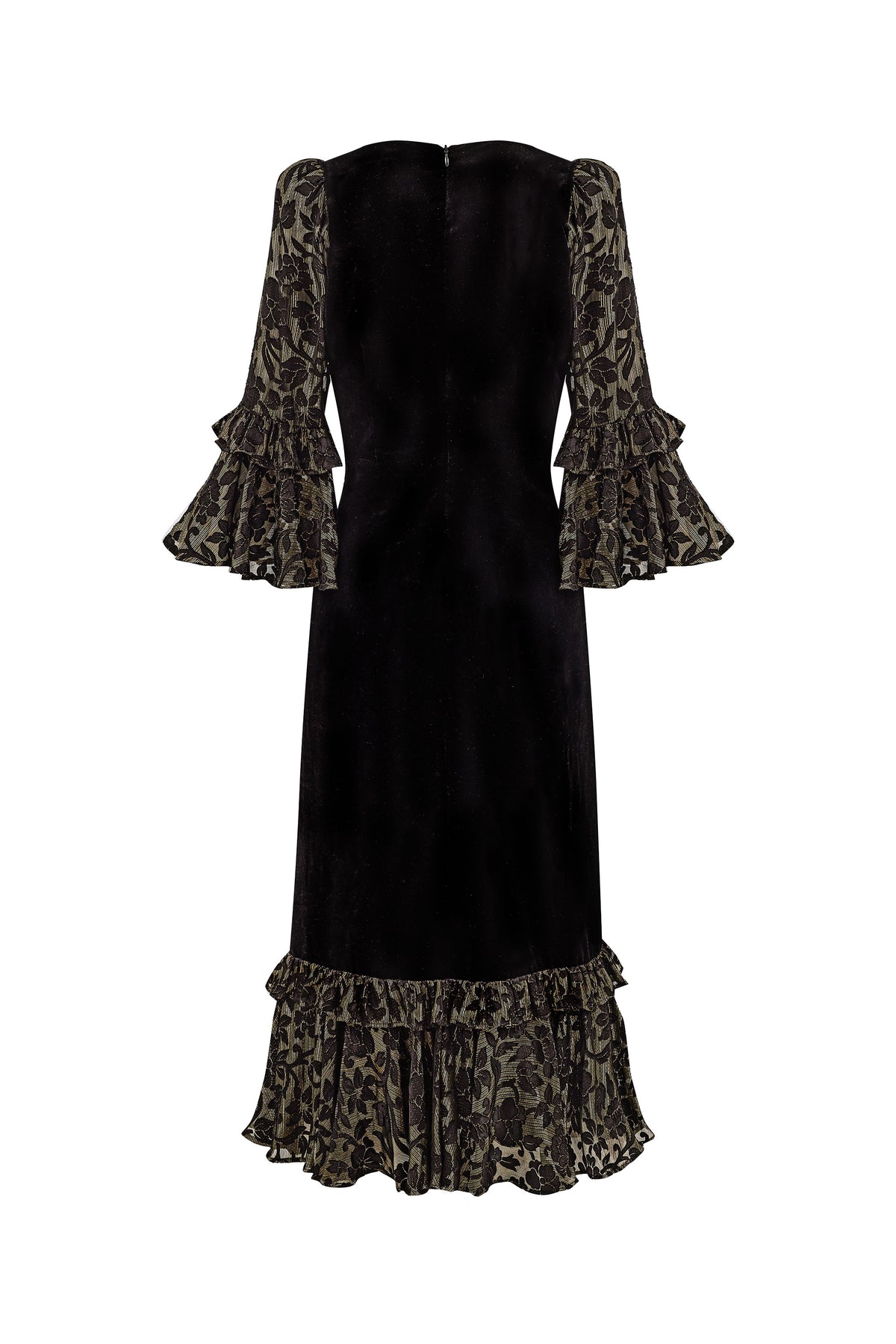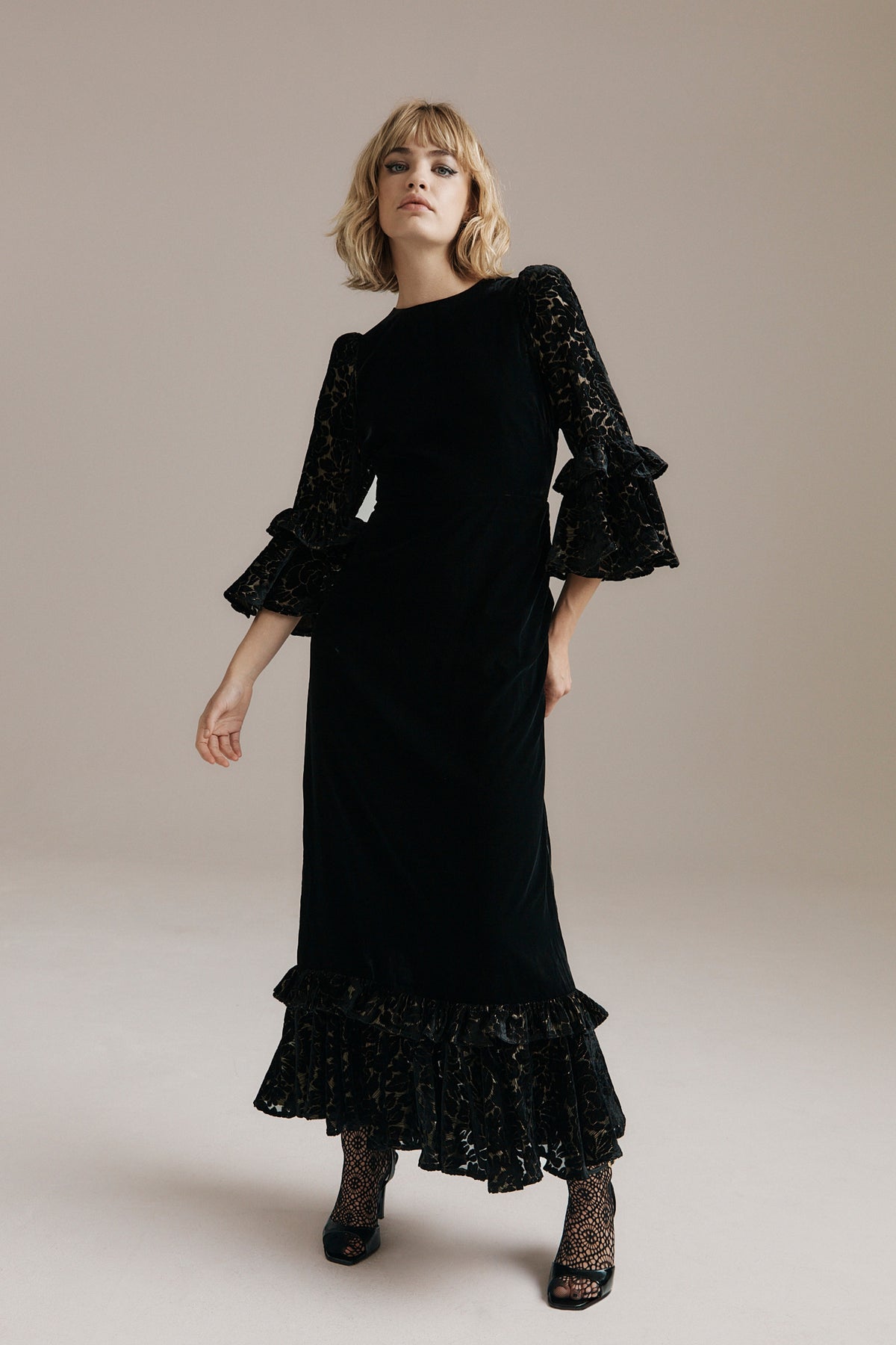 Rosa brings a refined winter glamour. Cut from deep black velvet, she skims the figure with quiet elegance before falling into a sweeping ruffled hem. Her sleeves and hem are crafted in floral devoré velvet, the pattern lined with fine gold lurex that catches the light like tiny winter sparks.