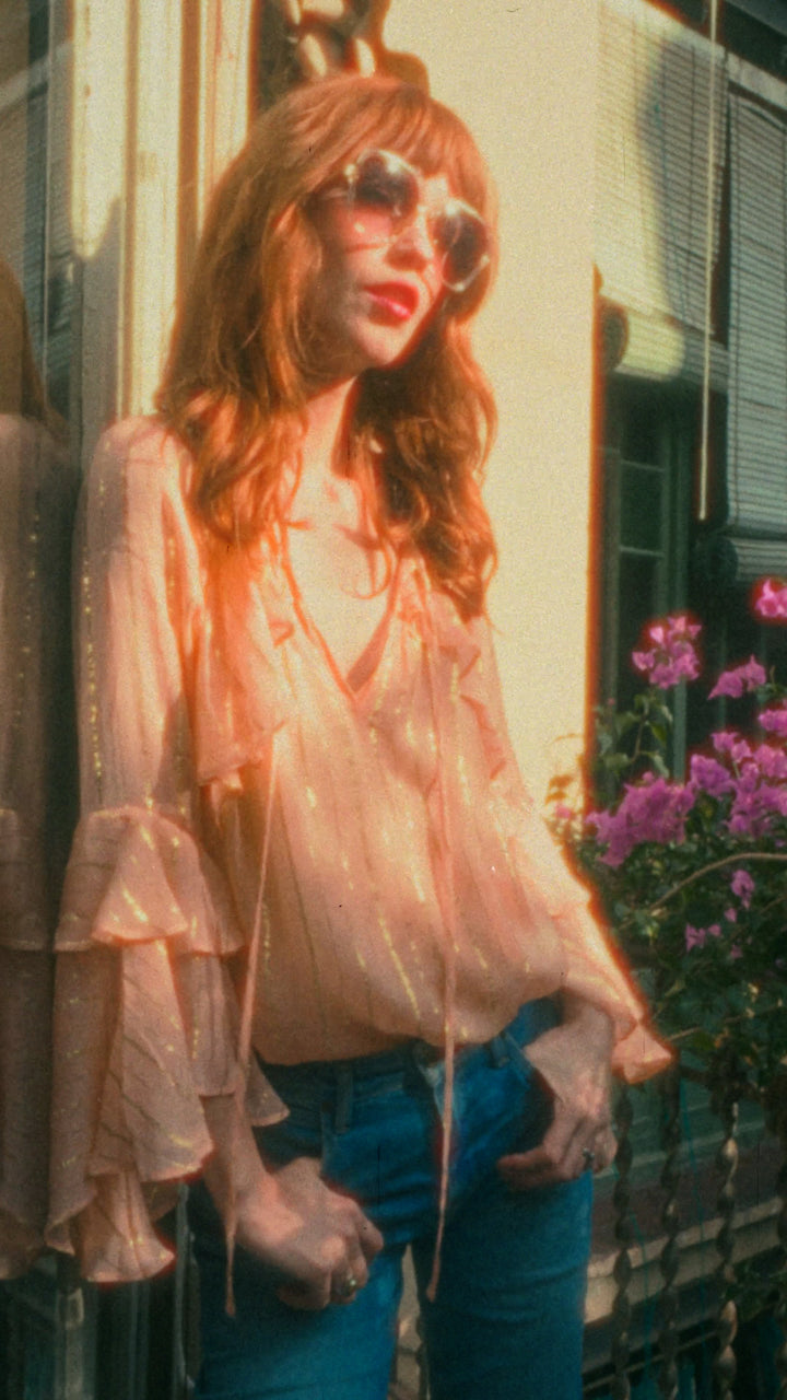 Shimmering with subtle splendour, Autumn is a blouse that captures the magic of golden-hour light. Delicately woven with golden-threaded lurex, she carries a touch of sunlight in every thread. Her waterfall double-frill sleeves ripple with poetic drama, flowing like liquid gold, while the keyhole and tie opening lend a hint of allure.
