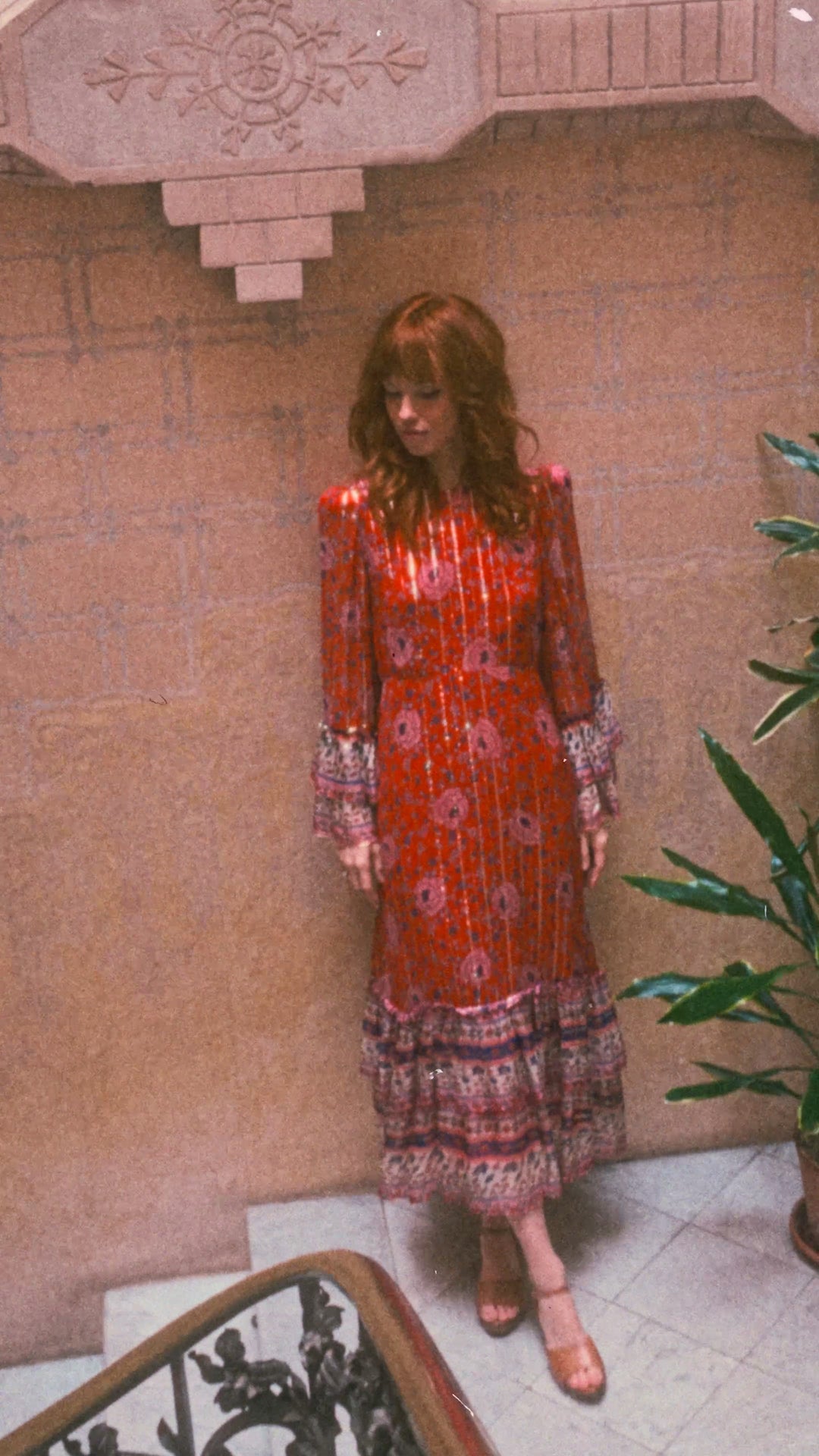 A harmony of vintage romance and bohemian spirit, Cassie sways with effortless allure in flowing red chiffon lurex. Her contrast border print adds a touch of whimsical opulence, accentuated by the double frill tiers at the sleeves and hem creating movement with every step. Playful yet poetic, Cassie is a love letter to the untamed romantic—made for sunlit days, starry nights, and the art of effortless glamour.